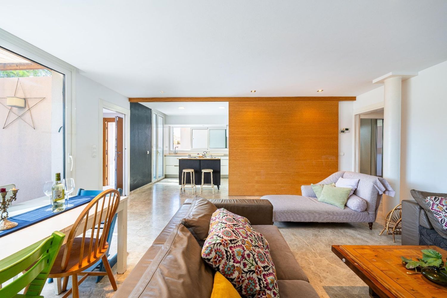 La casa se abre desde un jardín privado, cuidadosamente rodeado de vegetación madura y palmeras que aportan sombra, carácter y privacidad. Desde aquí se accede directamente al salón principal, un espacio amplio y lleno de luz natural gracias a una gran puerta acristalada que conecta interior y exterior, creando una fluidez perfecta entre ambos ambientes.