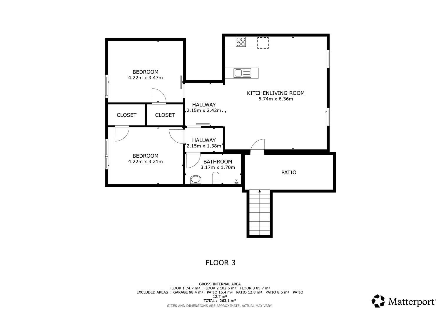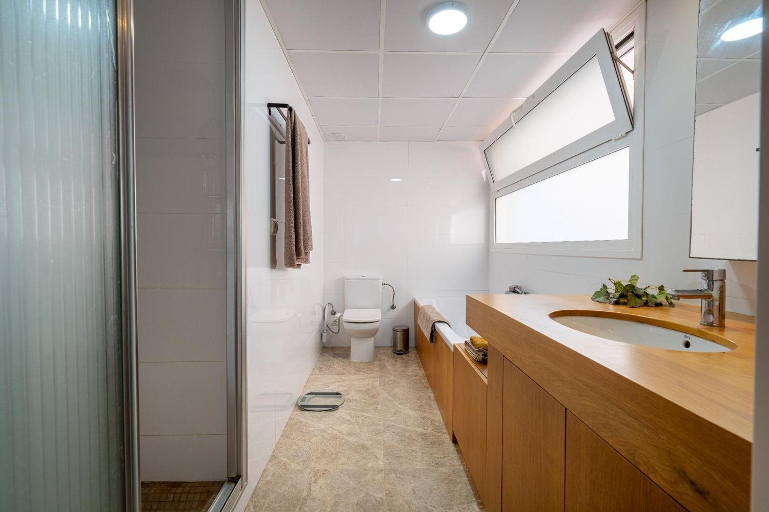 La planta inferior ofrece una zona más íntima y versátil, compuesta por dos dormitorios dobles, acceso directo a un patio privado y un baño que integra la zona de lavandería. En esta planta se encuentra también un impresionante garaje de 120 m², un espacio con múltiples posibilidades: aparcamiento, almacenamiento, taller creativo, gimnasio o incluso zona de ocio.