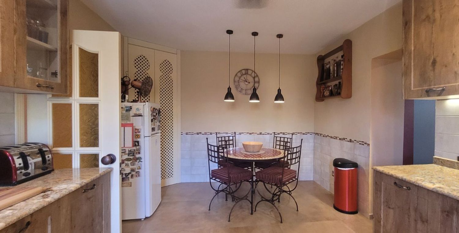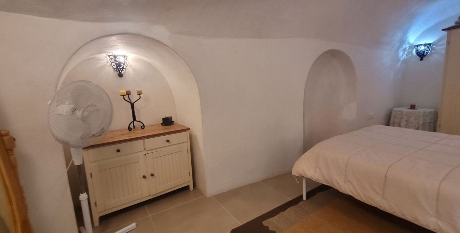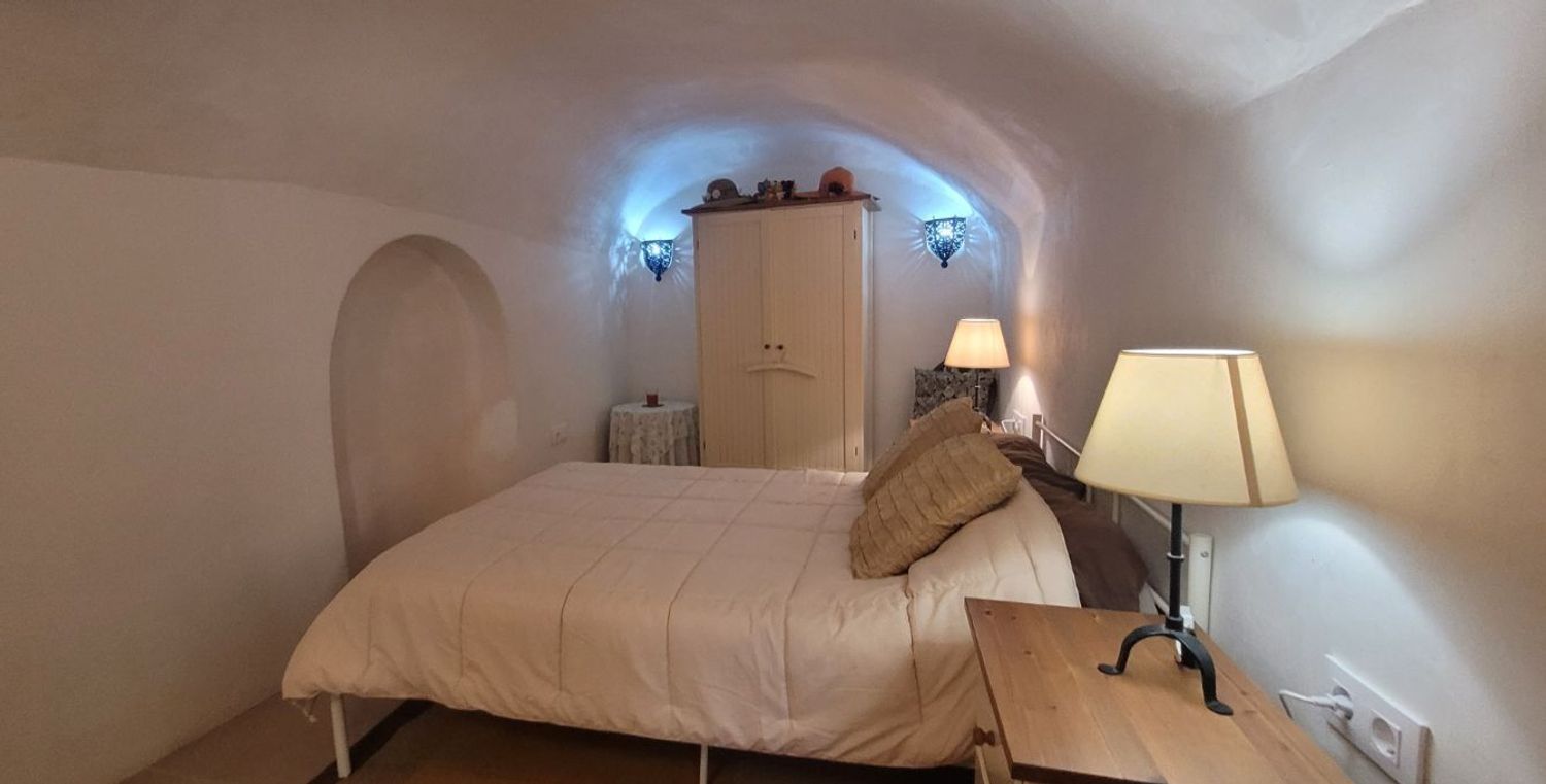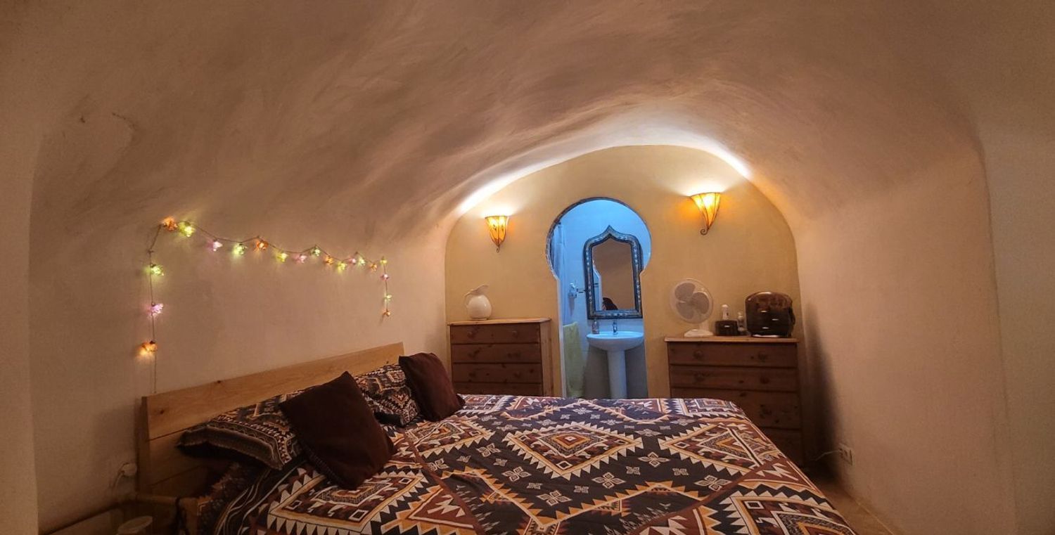 Un pasillo desde el segundo salón conduce a la amplia suite principal, un dormitorio elegante decorado con un estilo marroquí que aporta personalidad y calidez. La habitación incluye un cuarto de baño completo con ducha, proporcionando un ambiente íntimo y funcional.