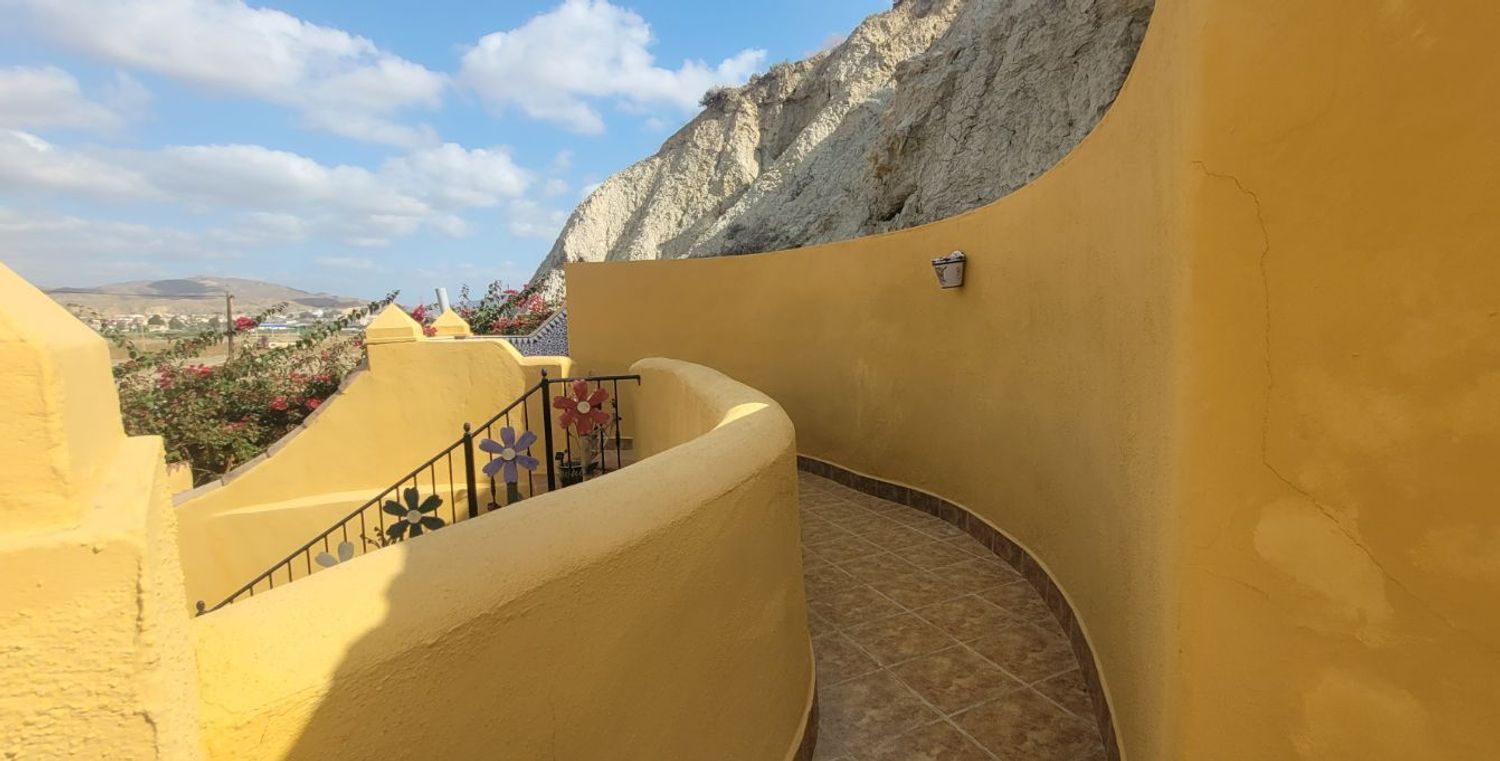 Desde el patio interior, una escalera conduce a la gran terraza en la azotea, uno de los espacios más especiales de la propiedad. Con amplio espacio para tumbonas, zona de comedor exterior y ducha al aire libre, esta terraza ofrece vistas espectaculares al campo y a la localidad de Cuevas del Almanzora. Es el lugar perfecto para tomar el sol, leer, celebrar reuniones o simplemente disfrutar de las puestas de sol del Mediterráneo.