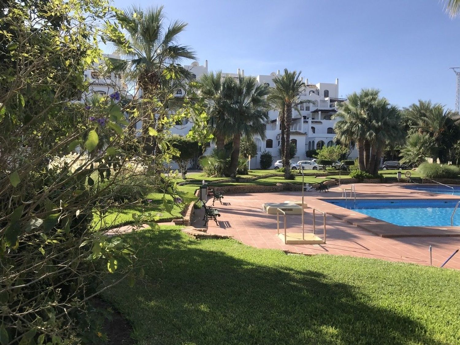 Elegante apartamento en planta baja en el exclusivo complejo Pueblo Dorado II, Mojácar Playa. Cuenta con 2 dormitorios y 2 baños, salón luminoso, cocina equipada y una amplia terraza privada con vistas a jardines comunitarios. Incluye piscina comunitaria, aparcamiento subterráneo asignado y trastero privado. Perfecto como vivienda habitual, inversión o hogar vacacional.