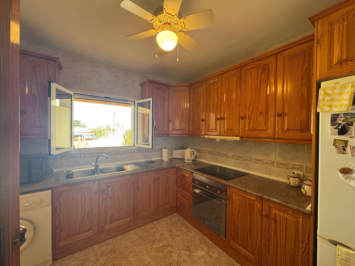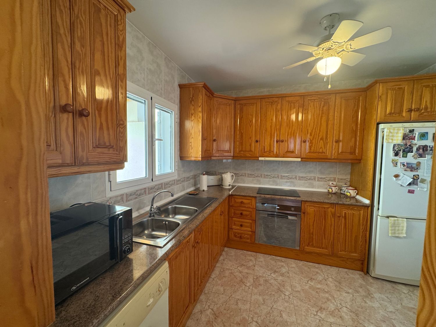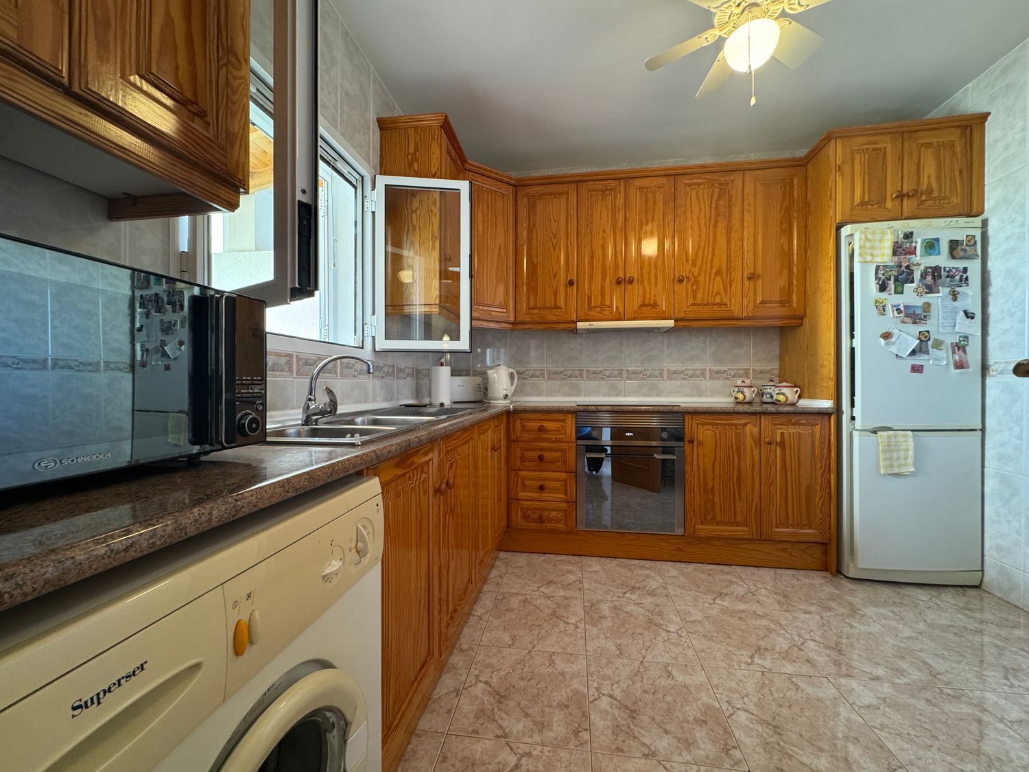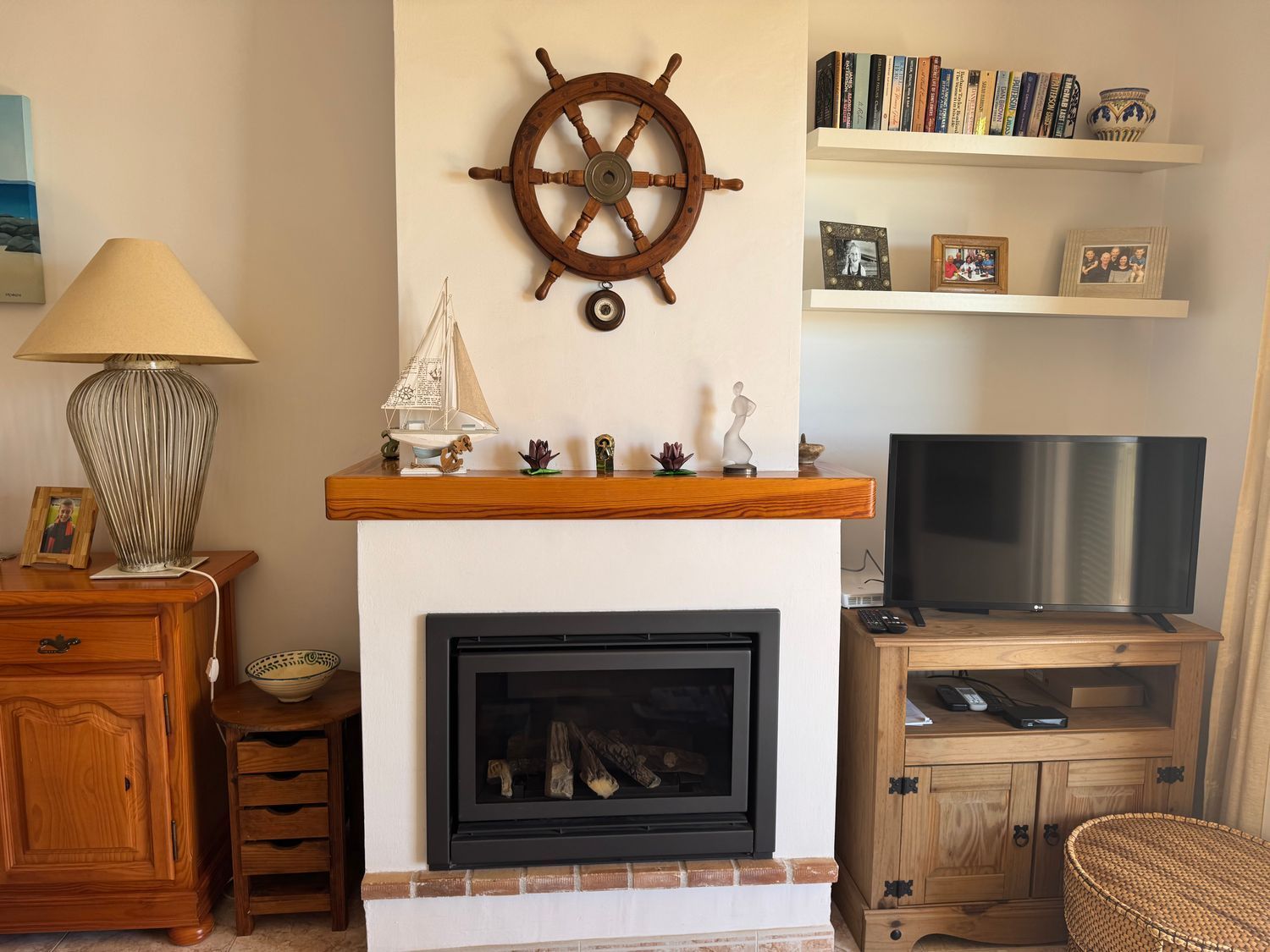 En la planta baja, la vivienda ofrece un recibidor que conecta con un luminoso salón equipado con aire acondicionado y una chimenea de gas con efecto leña. Las puertas correderas del salón conducen a una terraza de buen tamaño con impresionantes vistas al mar, ideal para desayunar al aire libre o relajarse disfrutando del paisaje. La cocina, amplia y funcional, dispone de abundante mobiliario, espacio de trabajo y luz natural.