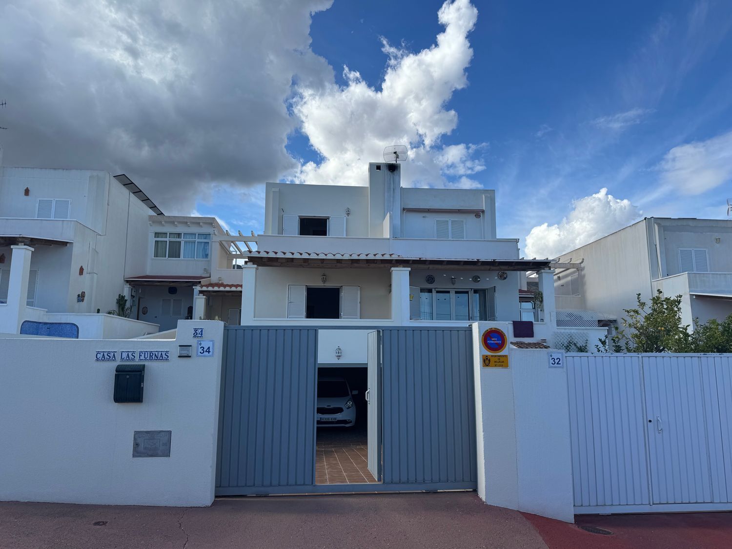 El acceso a la vivienda se realiza a través de una puerta automática que abre a un camino privado que conduce directamente al garaje cerrado de 28 m². A la izquierda del acceso se encuentra la piscina privada, acompañada de una ducha exterior, creando un espacio perfecto para disfrutar del clima mediterráneo en total intimidad. A pocos pasos se encuentra el porche cubierto que da acceso a la entrada principal.