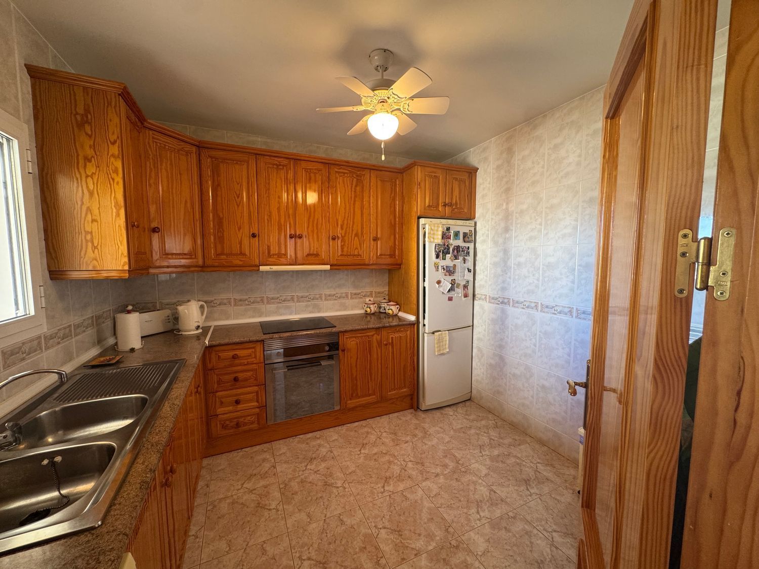 La planta baja incluye también dos dormitorios dobles, ambos con armarios empotrados, así como un baño completo. Además, bajo la escalera se encuentra un práctico armario con lavabo, lo que añade funcionalidad a esta planta. Desde el recibidor, una puerta trasera conecta con una enorme terraza situada en la parte posterior de la vivienda, desde la que se disfrutan magníficas vistas a la montaña.