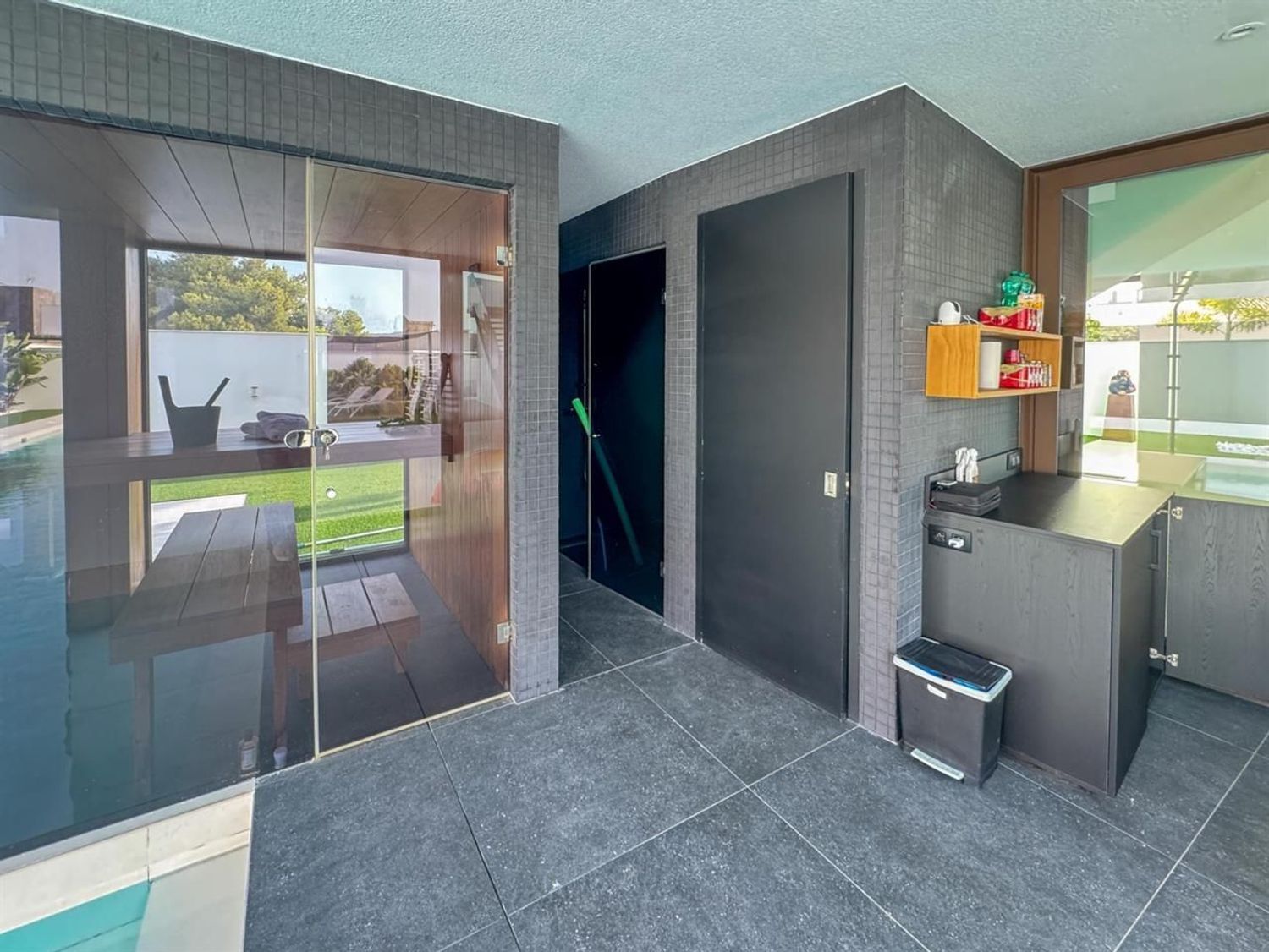 La planta baja alberga los dormitorios, todos con acceso directo a la zona exterior de relax, lo que aporta una sensación de continuidad entre el interior y el exterior. Desde esta planta se accede a las instalaciones de ocio privadas que hacen de esta villa una propiedad verdaderamente exclusiva: sauna privada, baño de vapor y una espectacular piscina que se extiende a lo largo de la parcela. La piscina está diseñada para su uso durante todo el año, ya que puede calentarse fácilmente, y está rodeada de amplias terrazas y jardines de bajo mantenimiento, creando un entorno perfecto para disfrutar del sol, el descanso y el entretenimiento.