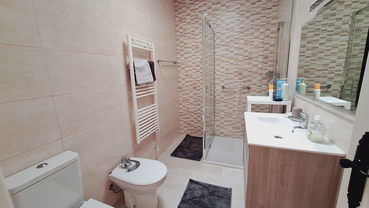 Al entrar en la vivienda, un espacioso pasillo organiza de forma práctica las distintas estancias. A la izquierda se encuentran dos dormitorios dobles, ambos equipados con aire acondicionado, mosquiteras y armarios empotrados, perfectos para uso familiar o como dormitorios para invitados. En este mismo lado hay un aseo de cortesía, muy conveniente para el día a día. A la derecha se sitúa el tercer dormitorio doble, también con aire acondicionado, mosquiteras y armarios empotrados, que puede funcionar como dormitorio principal o como habitación auxiliar según las necesidades del propietario. Avanzando por el pasillo se encuentra el baño de invitados, totalmente equipado y renovado con una ducha a ras de suelo moderna y cómoda.