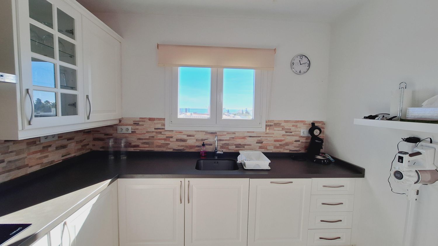 Cinco escalones conducen al salón principal, un espacio amplio, muy luminoso y acogedor, gracias a sus grandes ventanales y a su chimenea de ladrillo visto que aporta carácter y calidez. El salón cuenta también con aire acondicionado, garantizando confort durante todo el año. Desde esta estancia se accede a dos habitaciones adicionales: un elegante comedor con salida directa a una terraza dotada de fabulosas vistas al mar, y una cocina completamente equipada con mobiliario de alta calidad y electrodomésticos modernos.