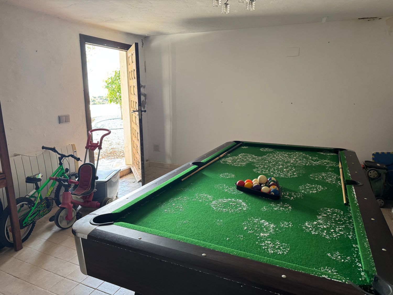 En el exterior, la propiedad cuenta con amplias zonas al aire libre ideales para disfrutar del clima mediterráneo durante todo el año. La piscina ofrece un espacio perfecto para relajarse o refrescarse mientras se admiran los paisajes que rodean la vivienda. Además, un garaje independiente y una sala adicional —actualmente utilizada como sala de juegos con mesa de billar— añaden funcionalidad y versatilidad al conjunto.