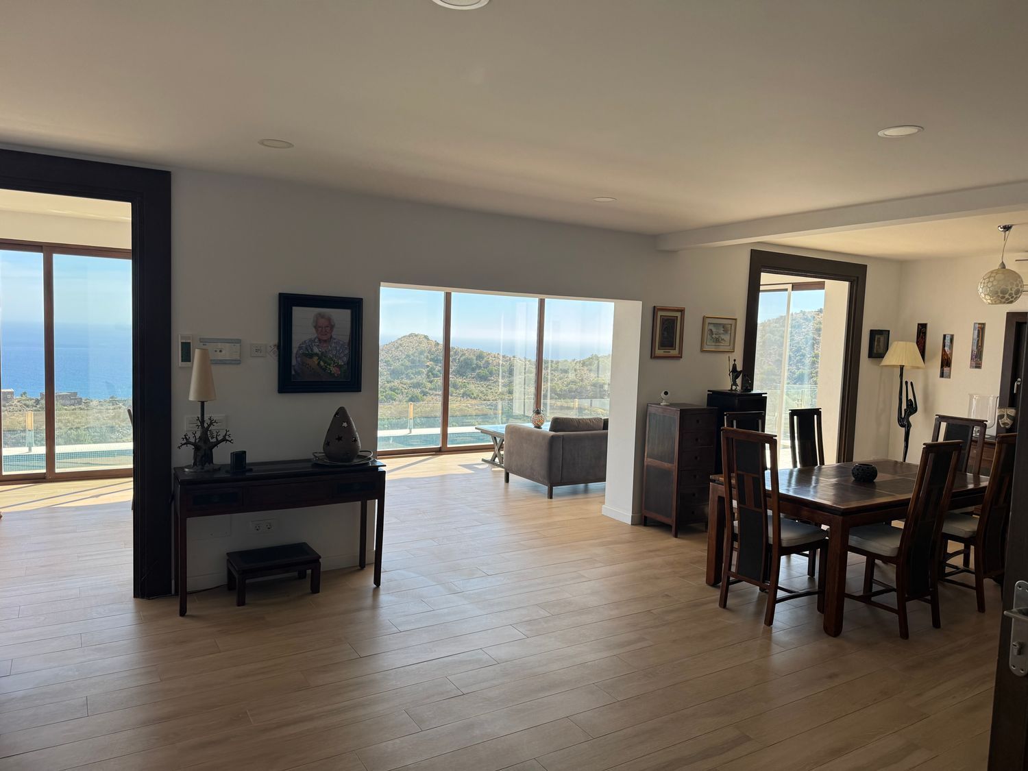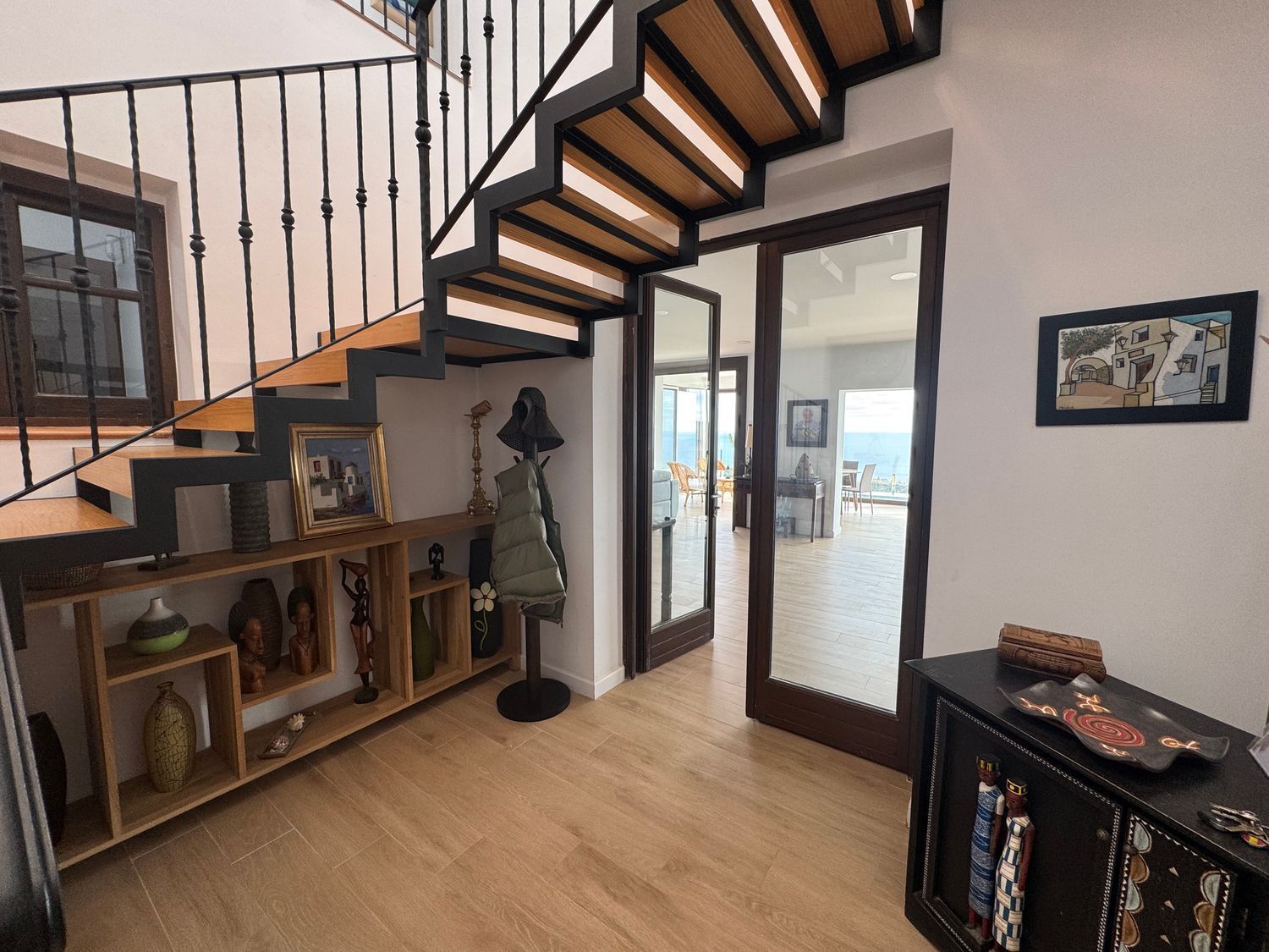 En la planta principal se encuentra un amplio y luminoso salón con grandes ventanales que enmarcan unas vistas absolutamente impresionantes del mar. Este espacio, concebido como área de estar y comedor de planta abierta, se integra con una cocina de diseño totalmente equipada con electrodomésticos de alta gama perfectamente integrados. La fluidez entre estos ambientes crea un espacio ideal tanto para el día a día como para recibir invitados en un ambiente sofisticado y relajado.