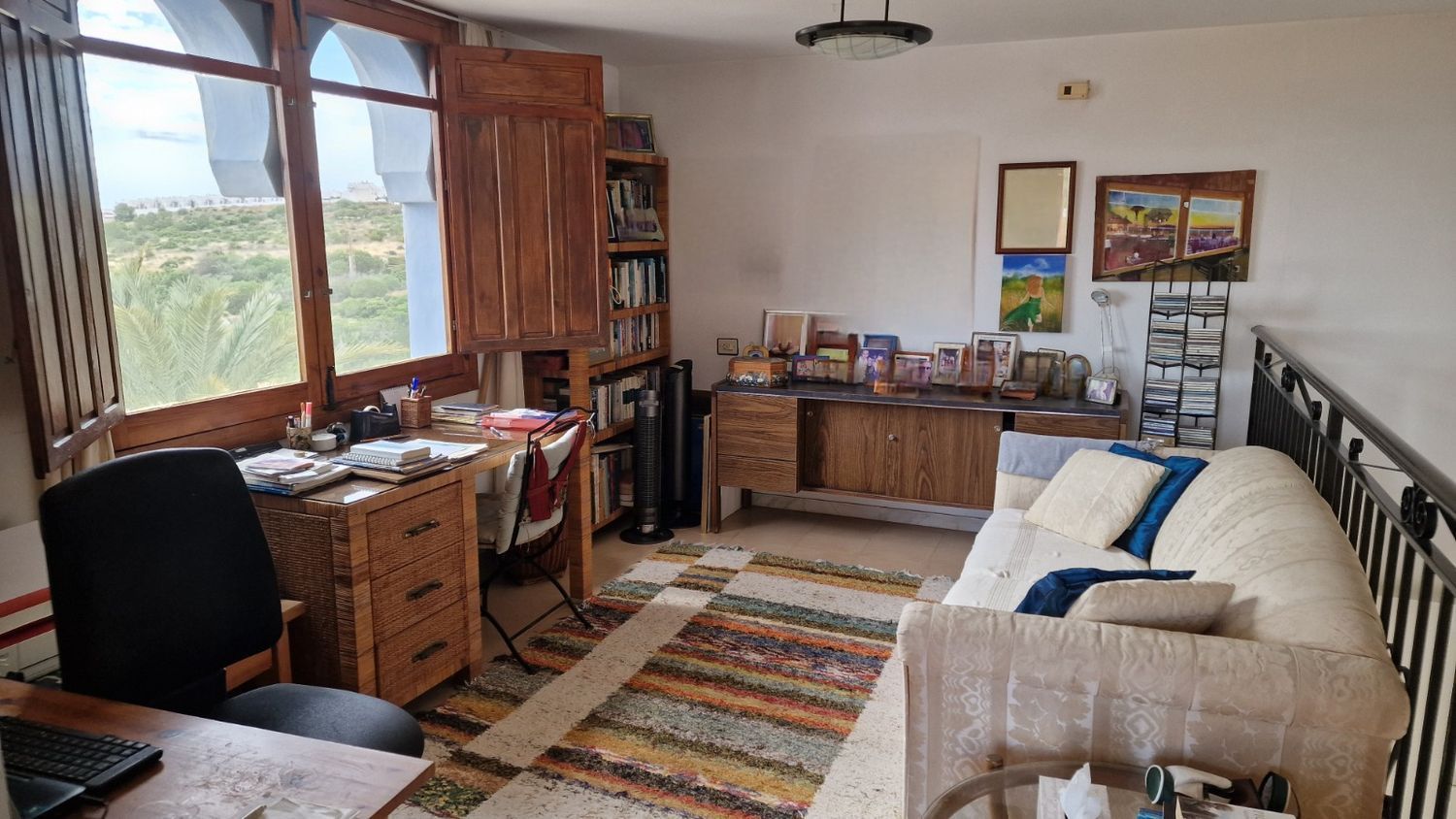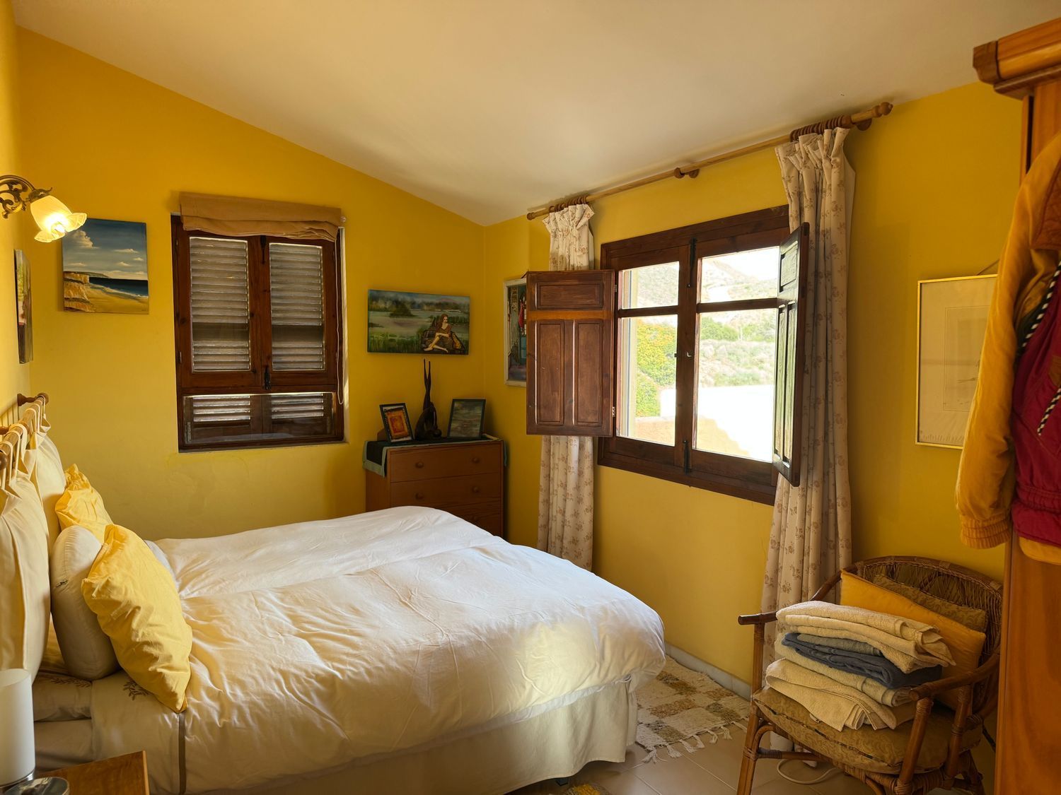 La primera planta ofrece un espacio abierto y versátil, ideal como zona de descanso, lectura o sala de estar adicional, desde donde se pueden contemplar maravillosas vistas al mar. En esta planta se encuentra un tercer dormitorio y un baño con ducha, aportando comodidad y privacidad. Desde aquí se accede a una amplia terraza con vistas abiertas tanto a las montañas como al mar, un lugar perfecto para disfrutar de atardeceres inolvidables.