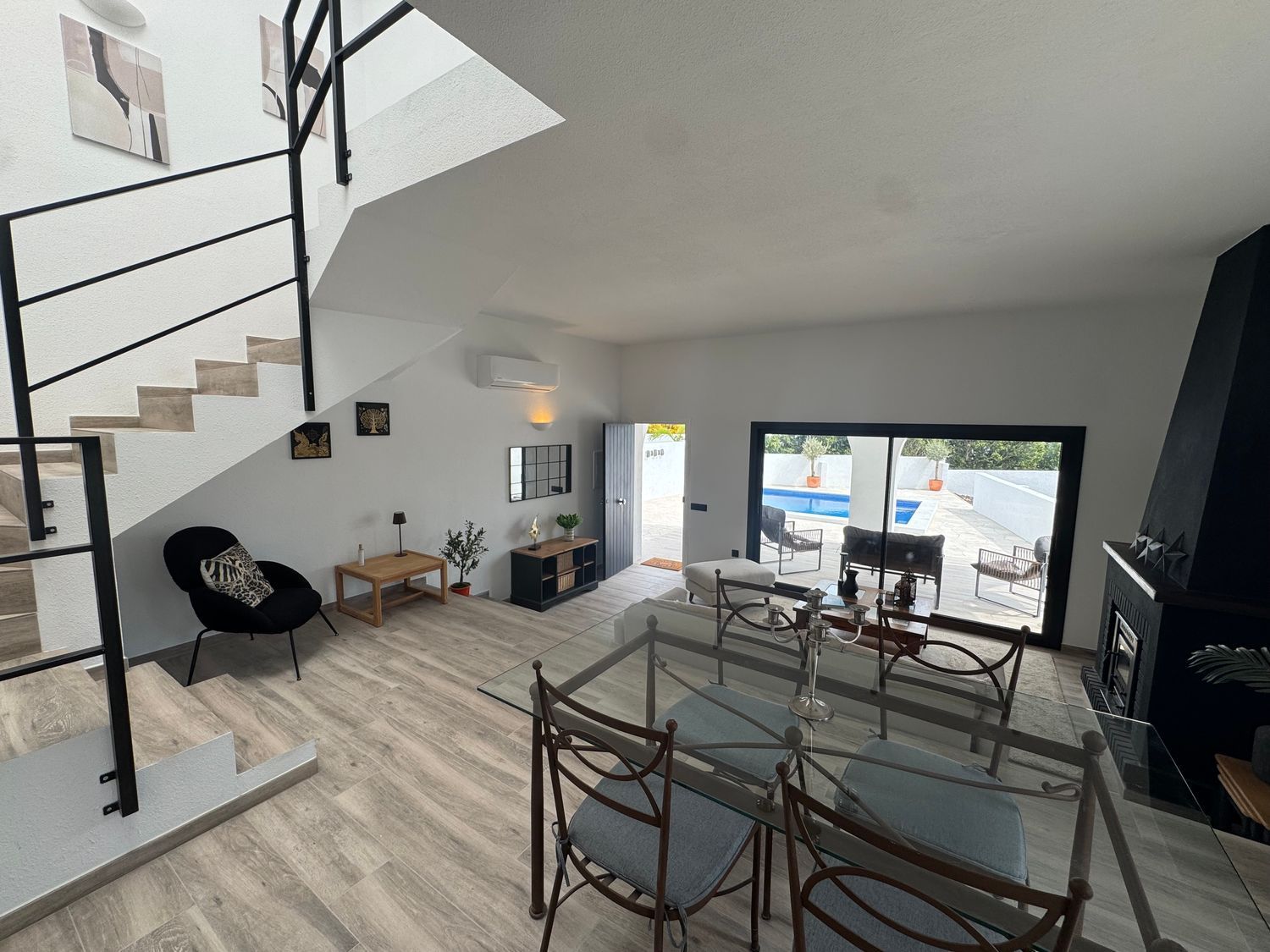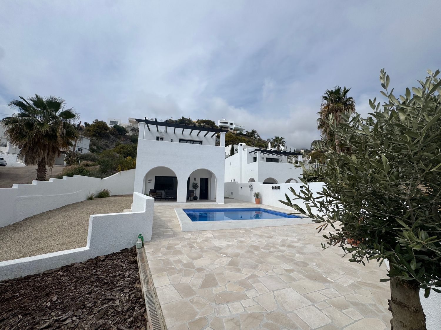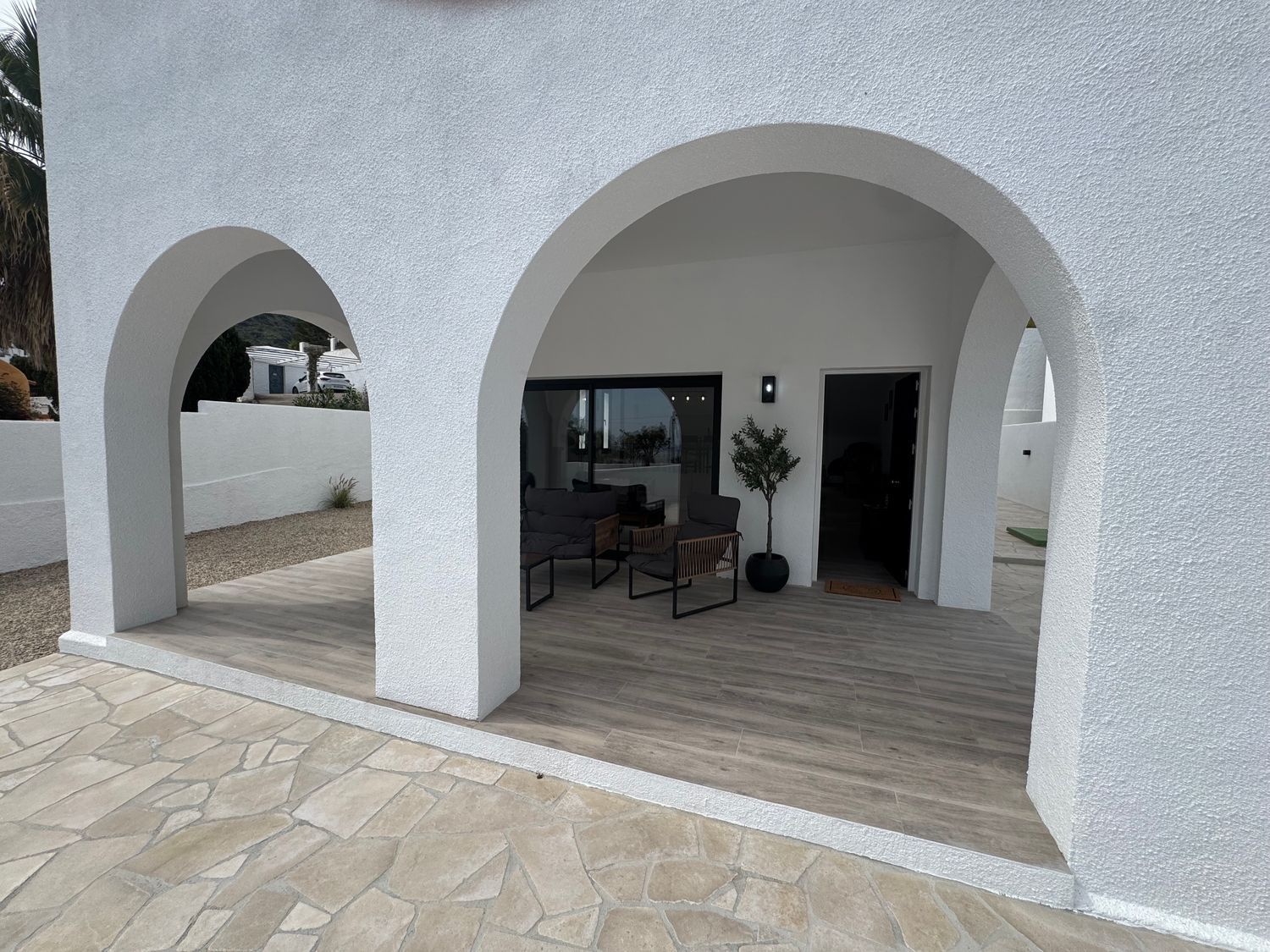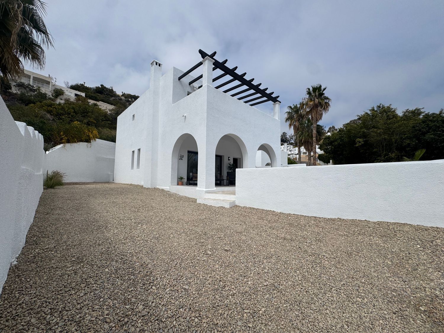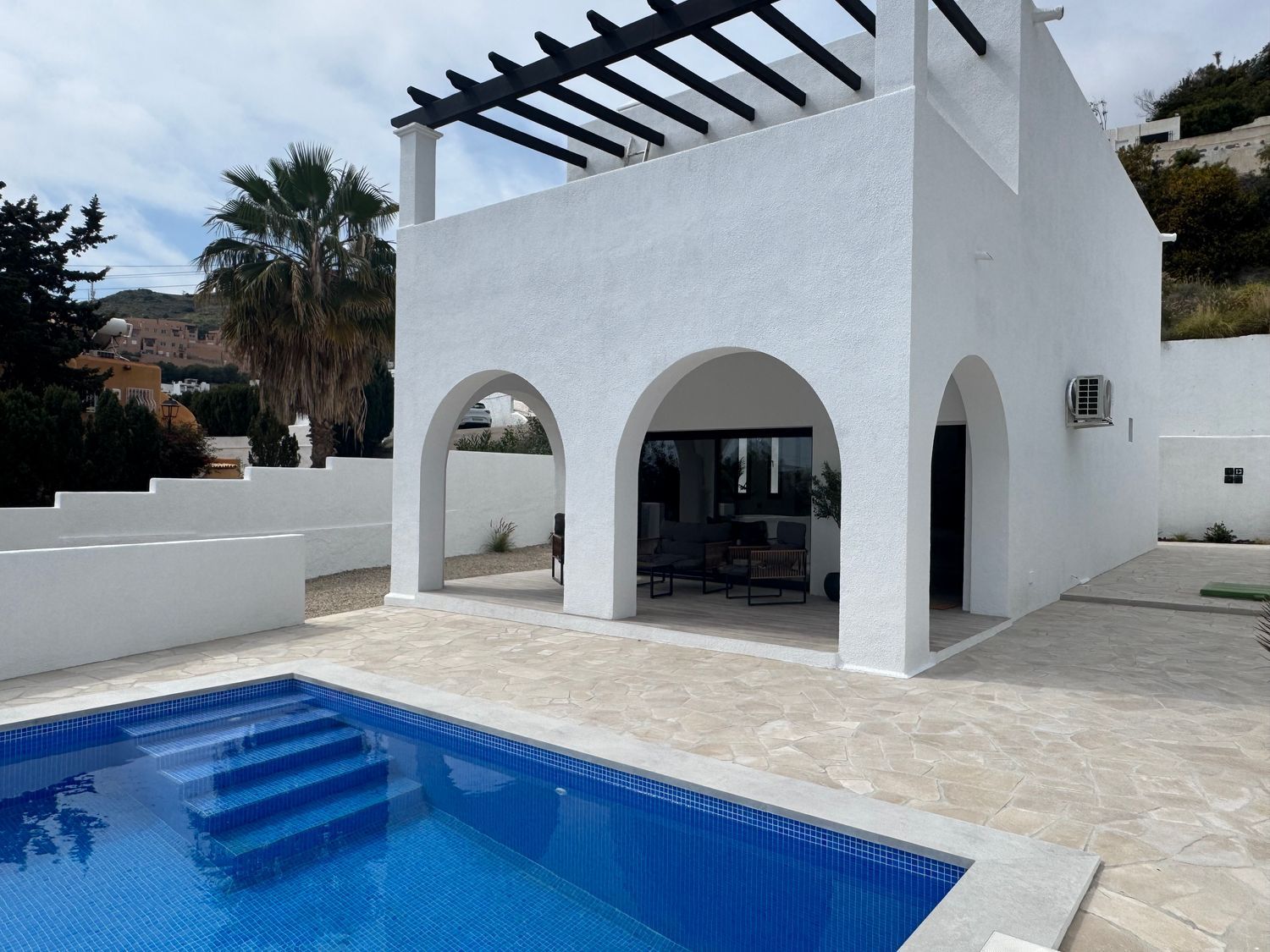 Elegante chalet independiente en Mojácar, a pocos pasos del mar. Con 3 dormitorios, 2 baños, piscina climatizada, terrazas, solárium y parcela de 545 m². Totalmente reformado y con paneles solares. Vivienda luminosa, eficiente y privada, ideal como residencia habitual o casa vacacional en una de las zonas más demandadas.