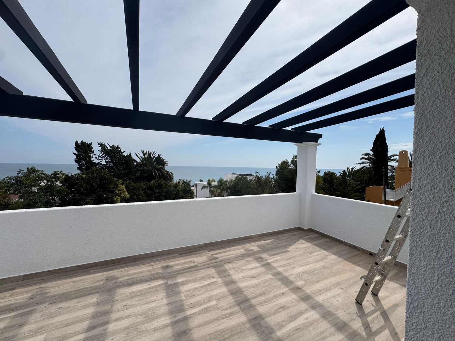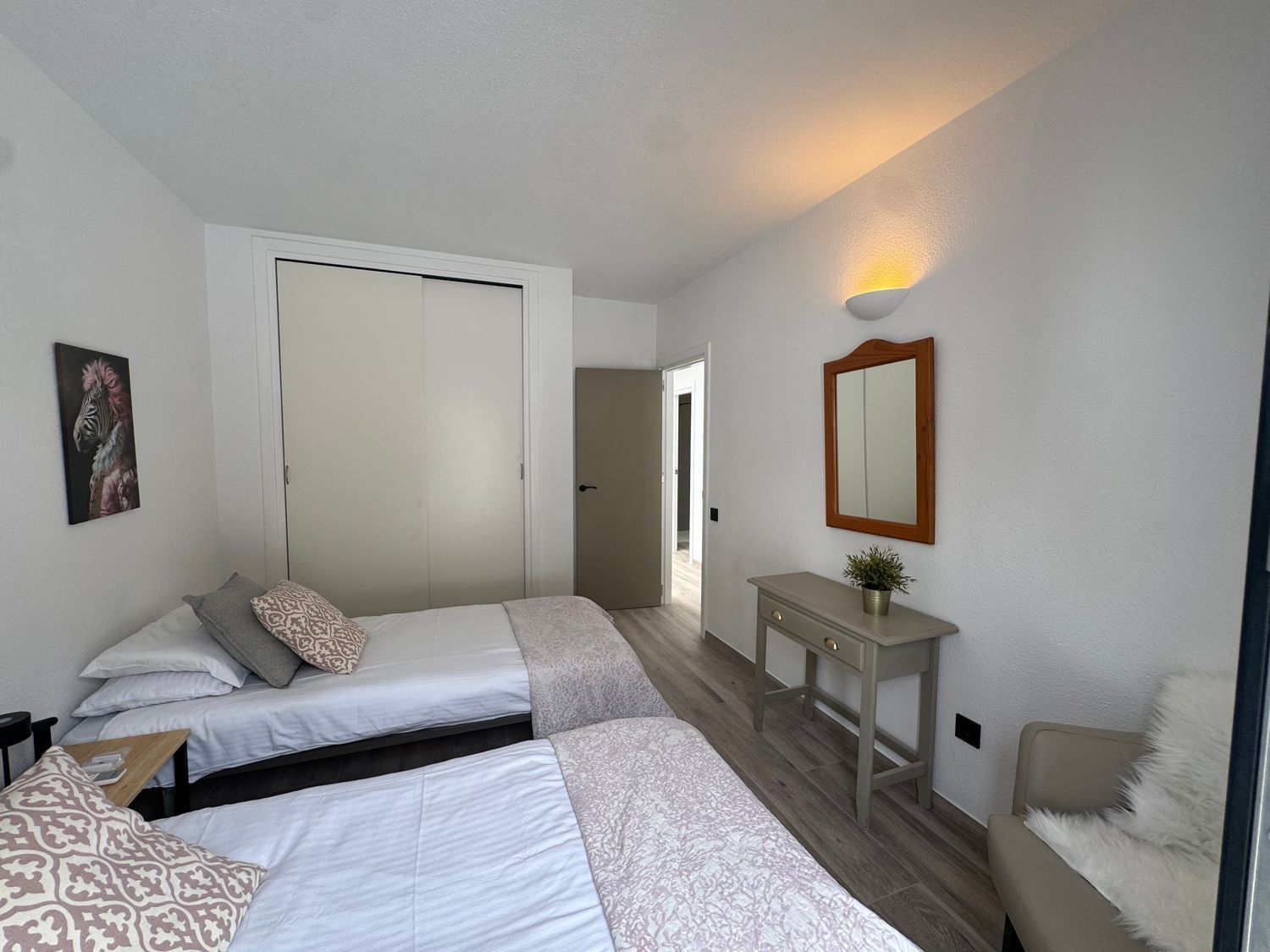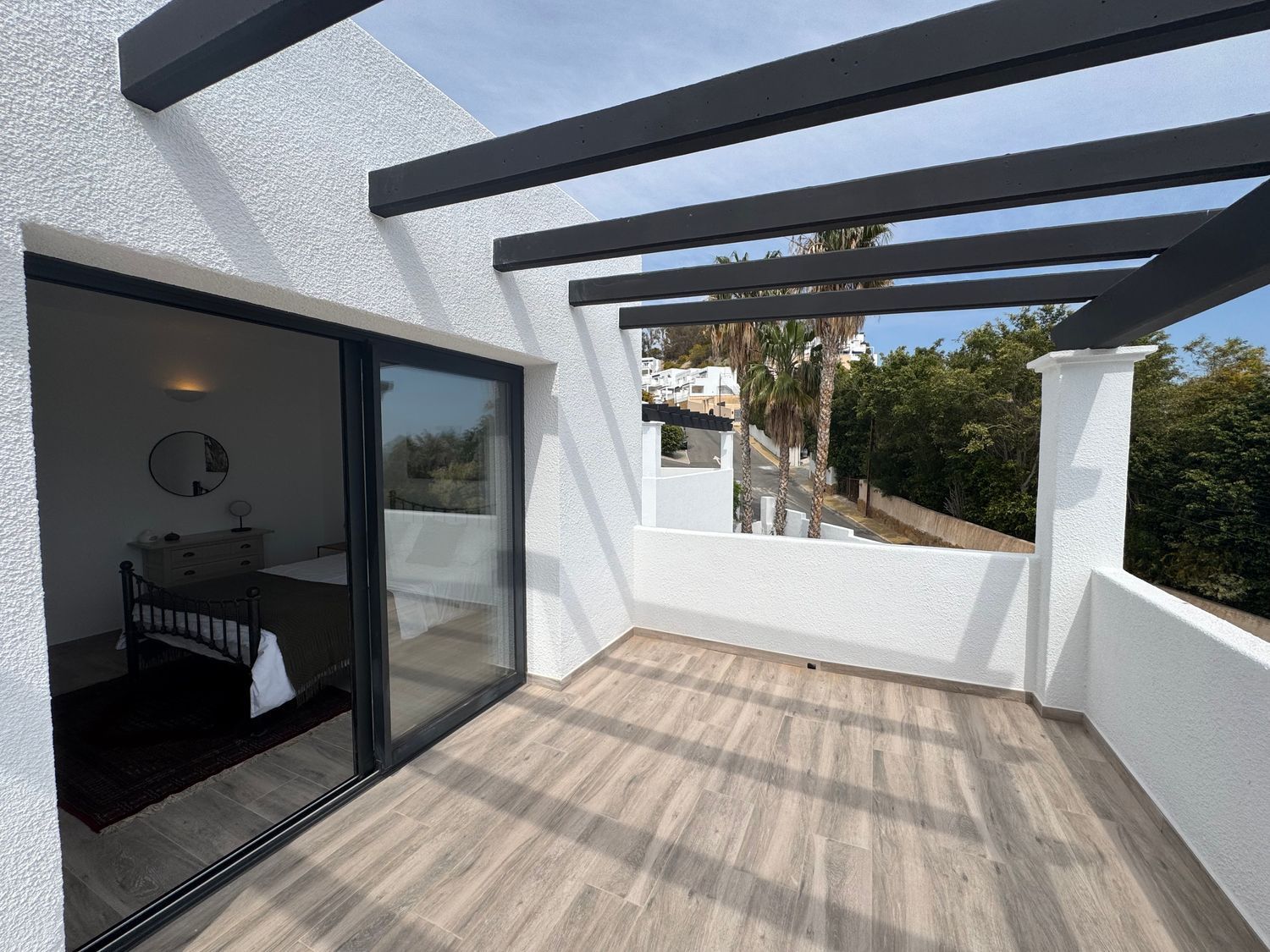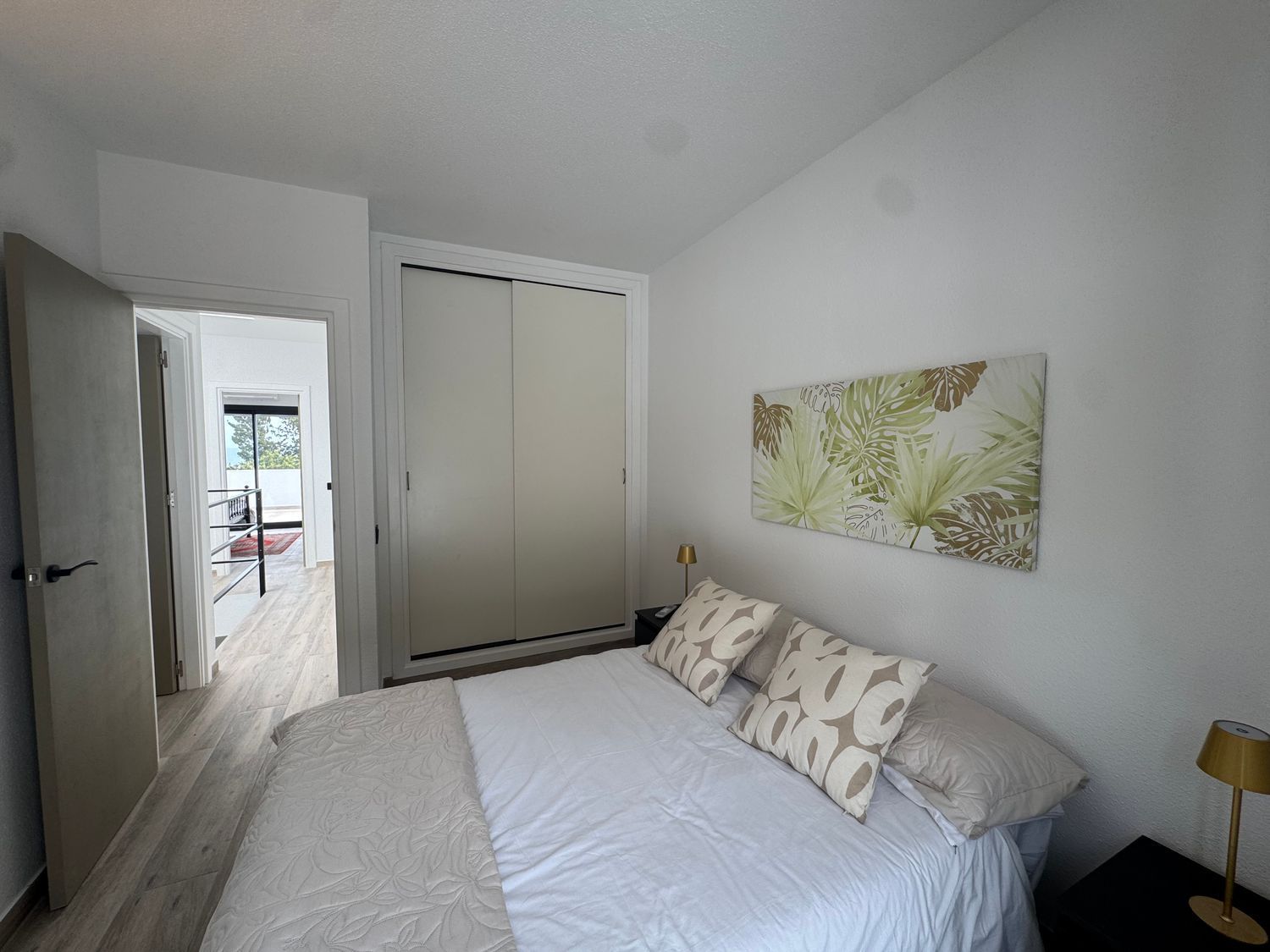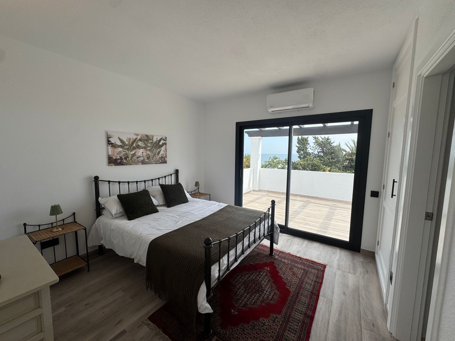 El dormitorio principal cuenta con acceso directo a una terraza privada, un espacio íntimo perfecto para comenzar el día con tranquilidad o relajarse al final de la jornada mientras se disfruta del entorno costero. Los otros dos dormitorios disponen de elegantes balcones franceses, que aportan encanto y refuerzan la conexión entre el interior de la vivienda y el paisaje exterior.