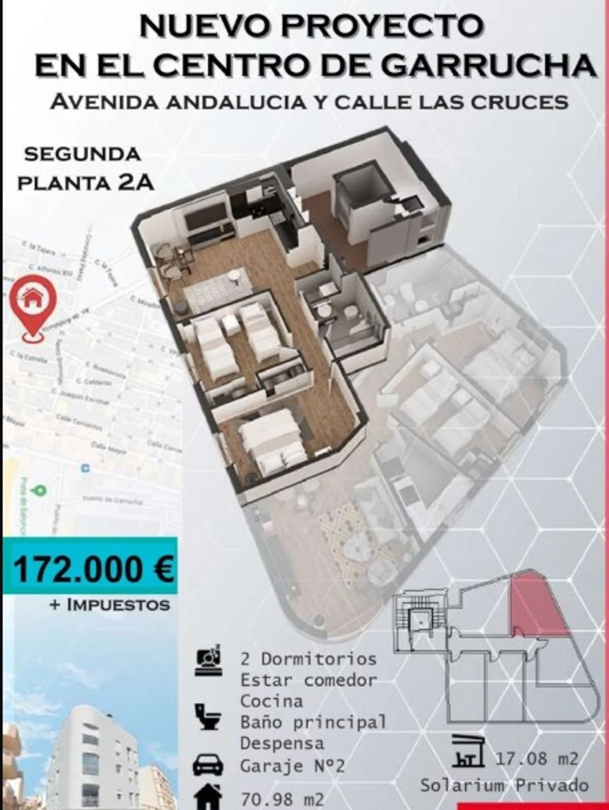 Apartamento de obra nueva en Garrucha – 2 dormitorios, 1 baño, plaza de garaje y solárium privado.Este elegante apartamento de nueva construcción en Garrucha es ideal para quienes buscan vivir junto al mar con todas las comodidades modernas. Con un diseño funcional y acogedor, cada espacio ha sido cuidadosamente optimizado para ofrecer confort y luminosidad...La vivienda dispone de 2 dormitorios, perfectos tanto para uso personal como para invitados, y 1 baño completo con acabados contemporáneos de alta calidad...El salón con cocina integrada ofrece un ambiente abierto y luminoso, ideal para el día a día o para relajarse después de un día de playa...Uno de los grandes atractivos de esta propiedad es su solárium privado en la azotea, un espacio exclusivo donde disfrutar del sol, las vistas y la brisa del Mediterráneo...Incluye también plaza de garaje, lo que añade comodidad y seguridad a la vida diaria...Ubicado en una zona tranquila y a solo unos pasos de la playa, este apartamento está cerca de todos los servicios: supermercados, restaurantes, transporte público, centros médicos, etc...Construido con materiales de alta calidad y diseño moderno, es ideal tanto como residencia habitual, segunda vivienda o inversión para alquiler turístico.