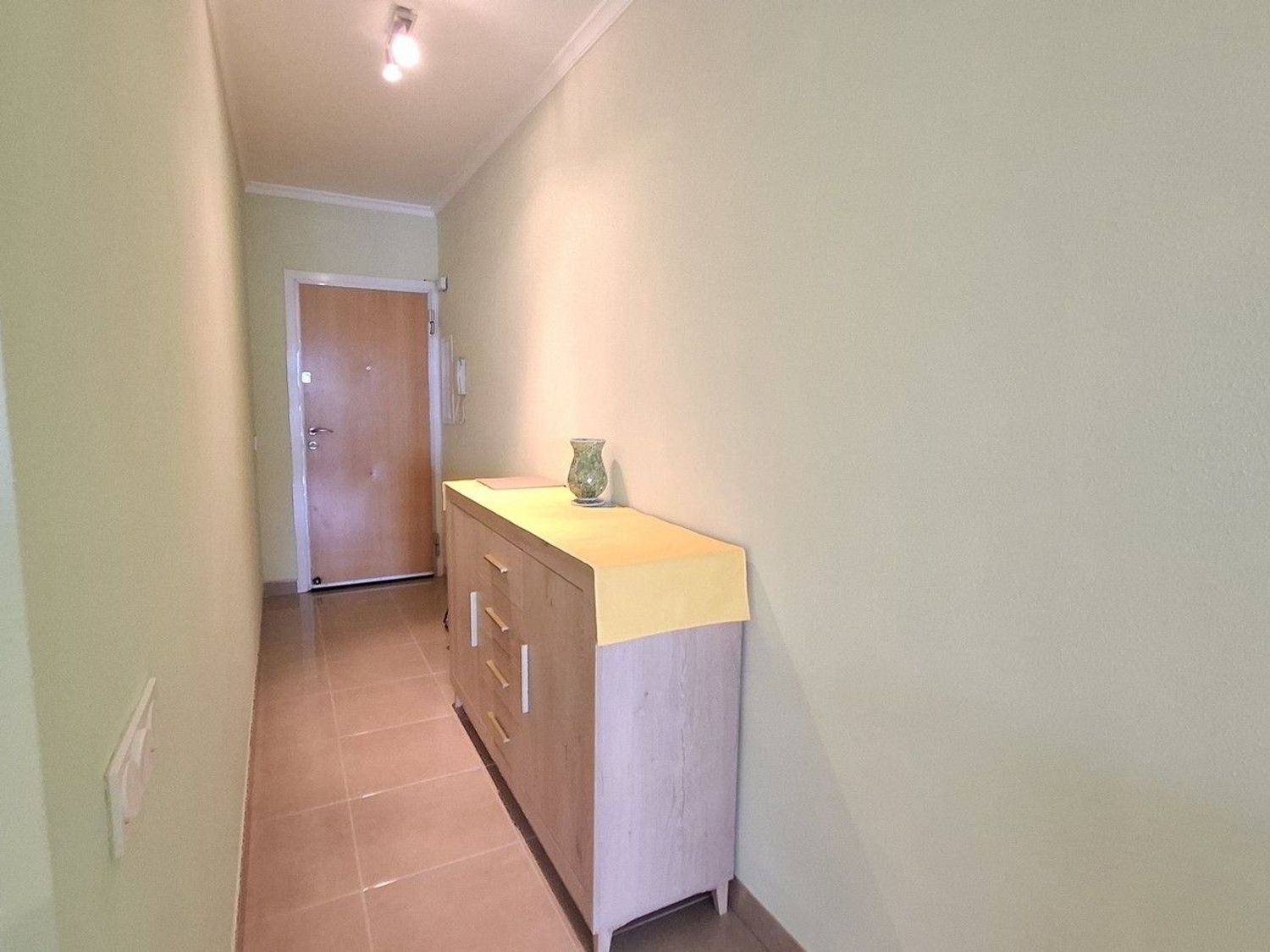 El acceso al apartamento se realiza mediante unas escaleras que conducen a la entrada principal. Al entrar, un pasillo luminoso y acogedor da la bienvenida, realzado por una decoración neutra y suelos de baldosas claras que aportan amplitud y luminosidad.