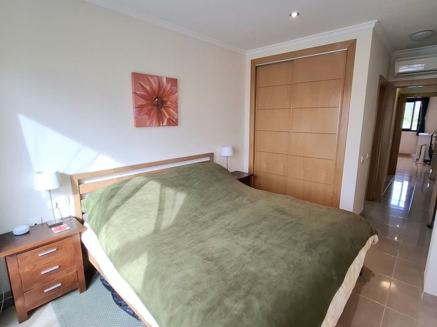 Desde el salón-comedor, un pasillo distribuye el acceso a los dormitorios y baños. El primer dormitorio se encuentra actualmente configurado como habitación individual, aunque dispone de espacio suficiente para incorporar una cama adicional si se desea. Cuenta además con armarios empotrados que ofrecen una excelente capacidad de almacenamiento.