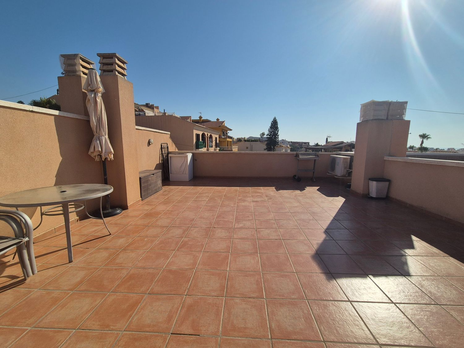 Desde el salón se accede a una agradable terraza frontal, con espacio suficiente para colocar mesa y sillas, perfecta para desayunos al aire libre o momentos de relax. Como gran valor añadido, la propiedad dispone de un espectacular solárium privado de aproximadamente 50 m², situado en la parte superior de la vivienda. Desde este espacio se disfrutan bonitas vistas al mar, convirtiéndolo en el lugar ideal para tomar el sol, organizar comidas al aire libre o simplemente disfrutar de la tranquilidad y el clima mediterráneo en compañía de la familia.