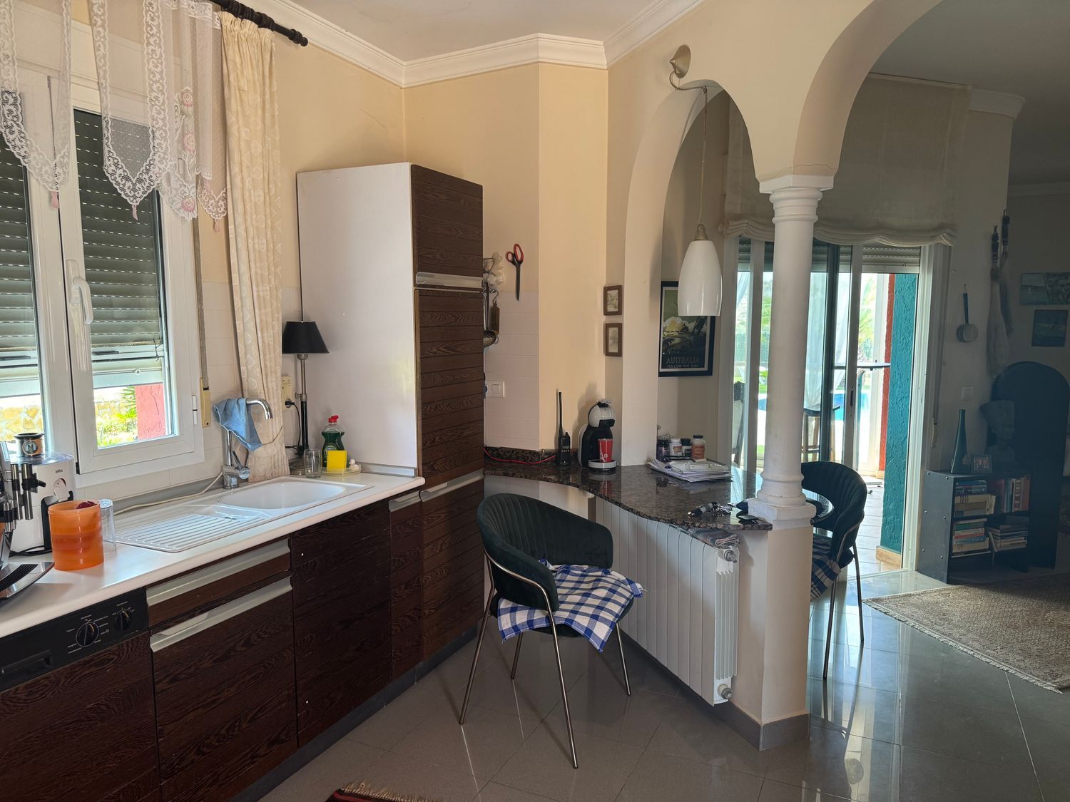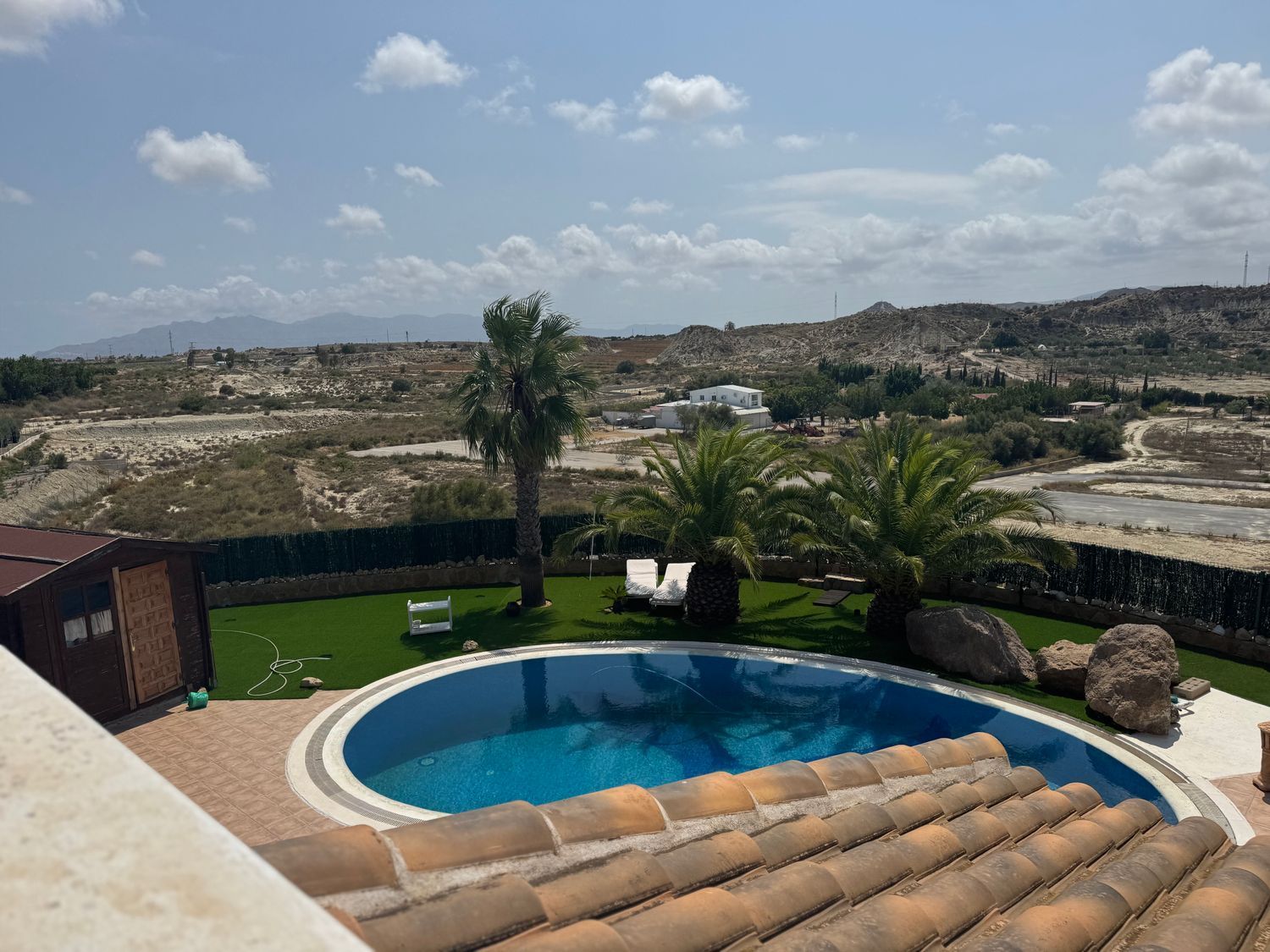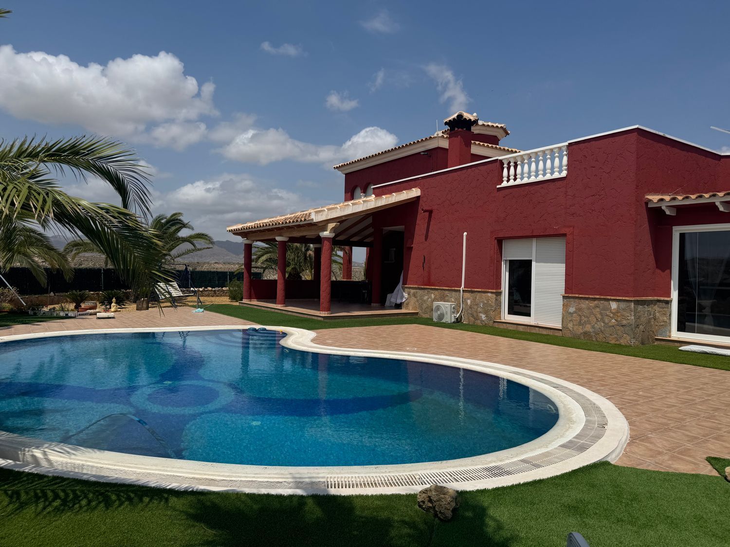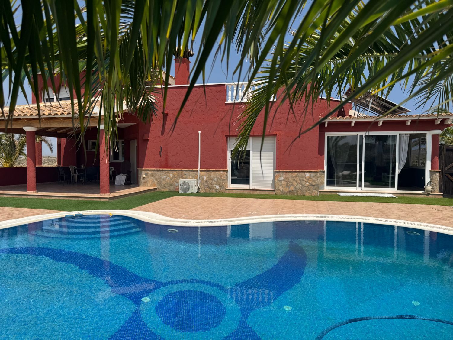 El chalet está equipado con calefacción central por gasóleo, sistema solar para agua caliente, 14 paneles solares para generación eléctrica, aire acondicionado y ventiladores de techo, garantizando confort y eficiencia energética durante todo el año. En el exterior destaca una piscina privada de 10 x 6 metros con forma de riñón, rodeada de numerosas terrazas abiertas y cubiertas, además de un solárium en la azotea ideal para disfrutar del entorno. Completa la propiedad un garaje con capacidad para dos vehículos.