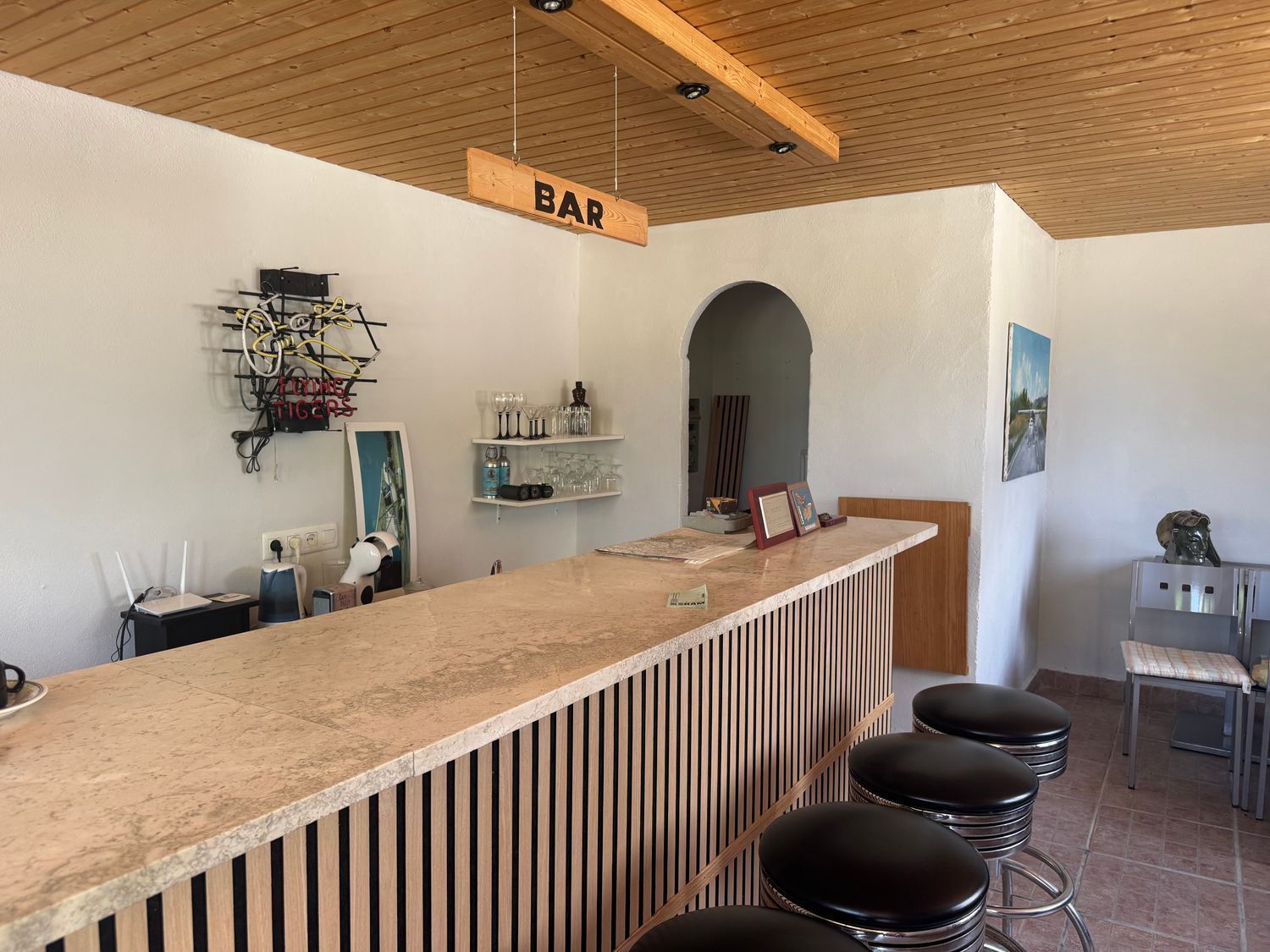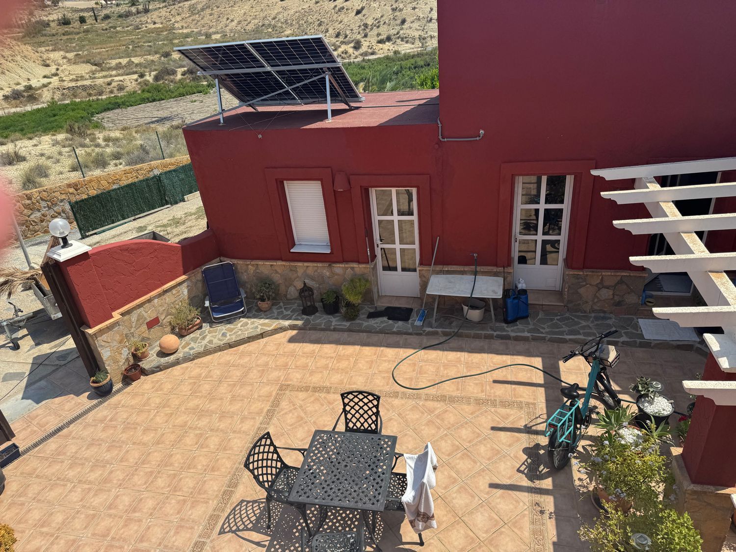 Presidiendo la propiedad se alza un chalet independiente de diseño, construido hace aproximadamente 14 años, organizado en torno a un encantador patio interior con vistas directas al aeródromo. La vivienda principal cuenta con un amplio salón, comedor independiente y una cocina de gran presencia, auténtico corazón del hogar. Dispone de tres dormitorios y tres baños, todos ellos diseñados para ofrecer comodidad y privacidad. Al otro lado del patio se encuentra un estudio independiente con un dormitorio, perfecto para invitados o alojamiento adicional.