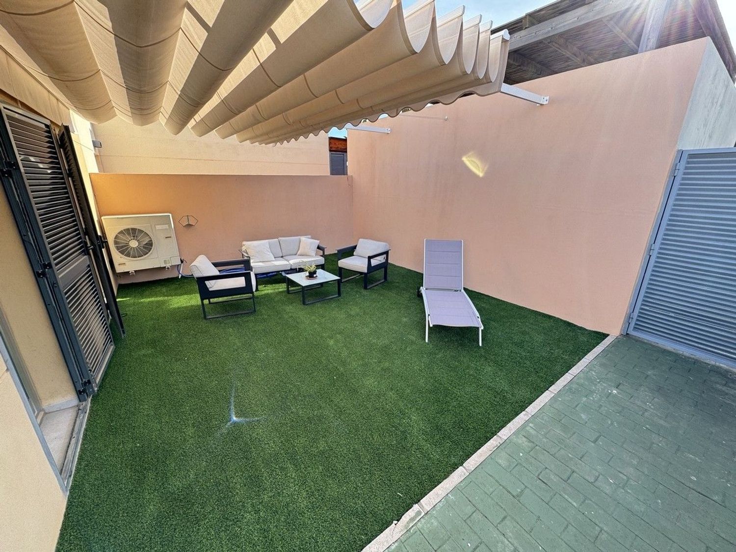 El acceso a la villa se realiza a través de una entrada privada con portón y unos pocos escalones que conducen a la vivienda, distribuida íntegramente en un solo nivel. Al llegar, encontramos una primera terraza privada ajardinada, un acogedor espacio exterior con zona de sombra y acceso directo desde ambos dormitorios, perfecta para disfrutar del clima durante todo el año.