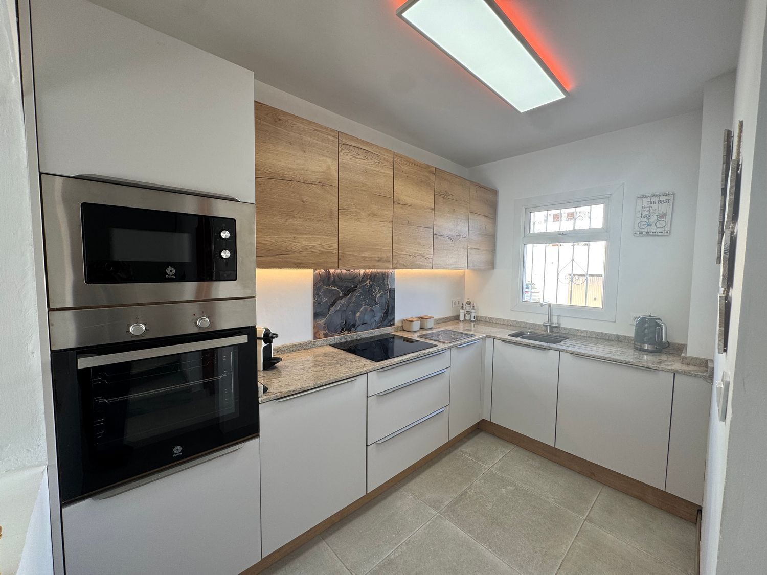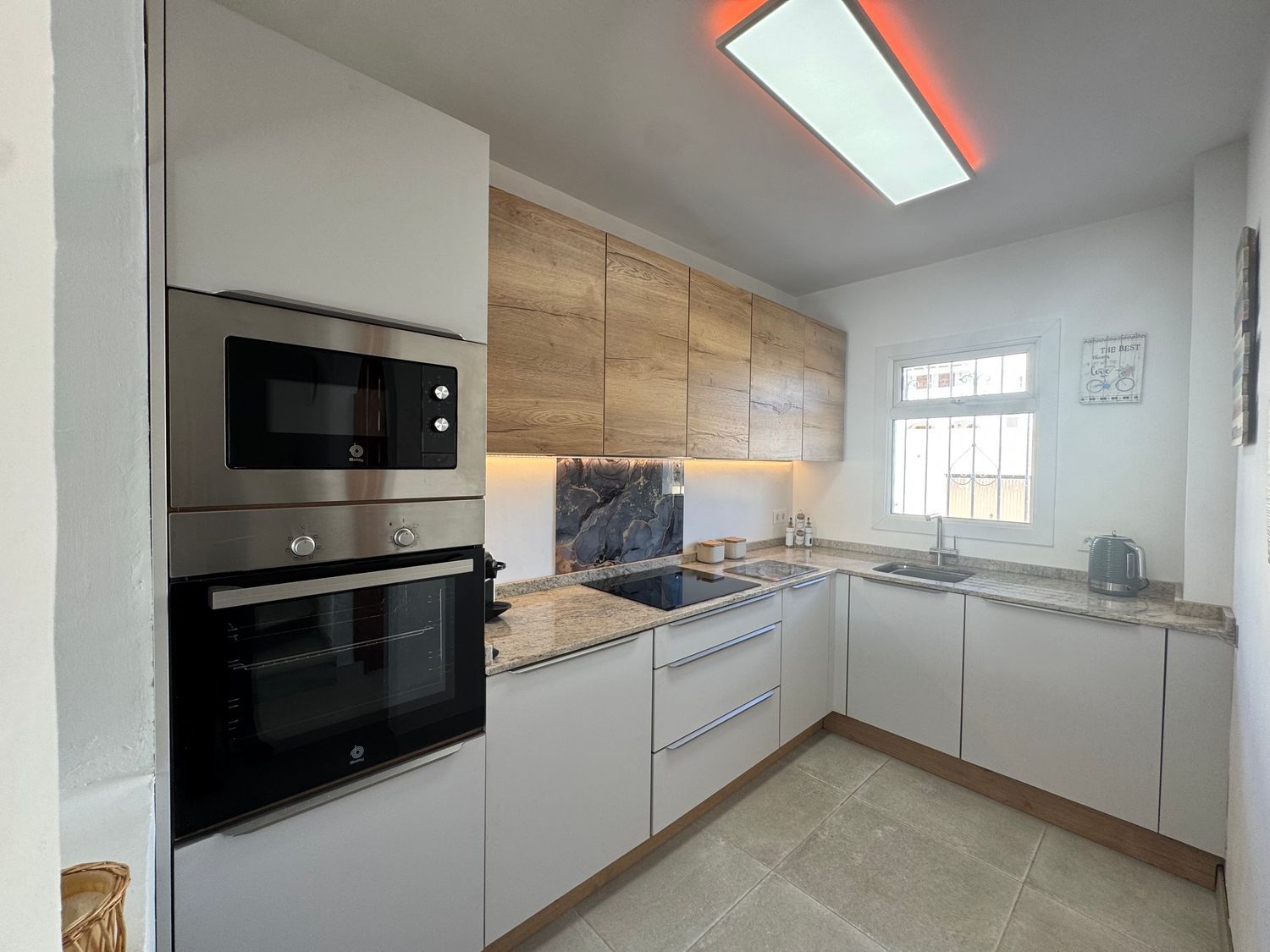 En la planta baja, encontramos una cocina de alta tecnología de reciente instalación, equipada con electrodomésticos modernos y soluciones de almacenamiento eficientes, ideal tanto para el uso diario como para quienes disfrutan de la cocina. A continuación, se abre un amplio salón-comedor, que destaca por su luminosidad y confort. Este espacio cuenta con chimenea, aire acondicionado y acceso directo a la terraza exterior a través de puertas acristaladas, creando una conexión perfecta entre el interior y el exterior, ideal para disfrutar del clima mediterráneo durante todo el año.