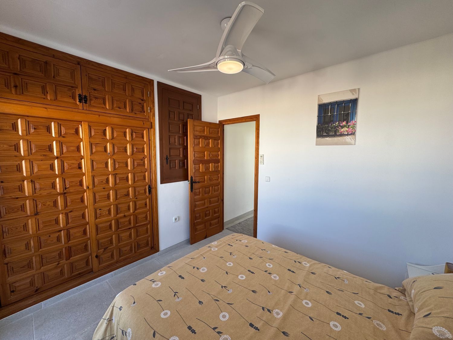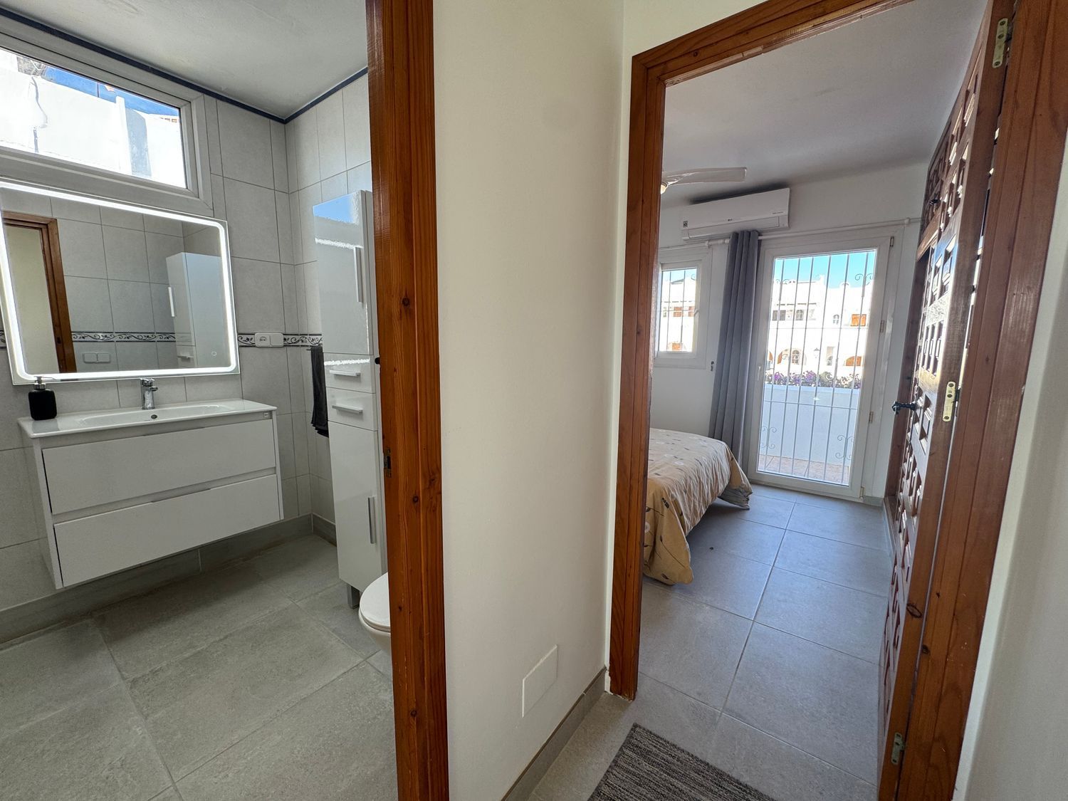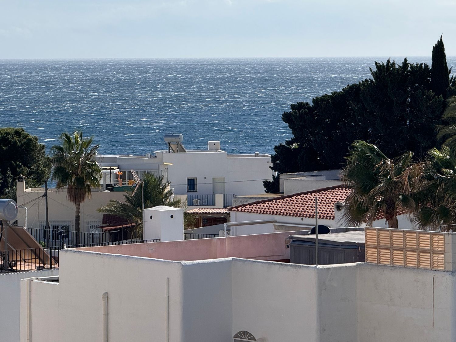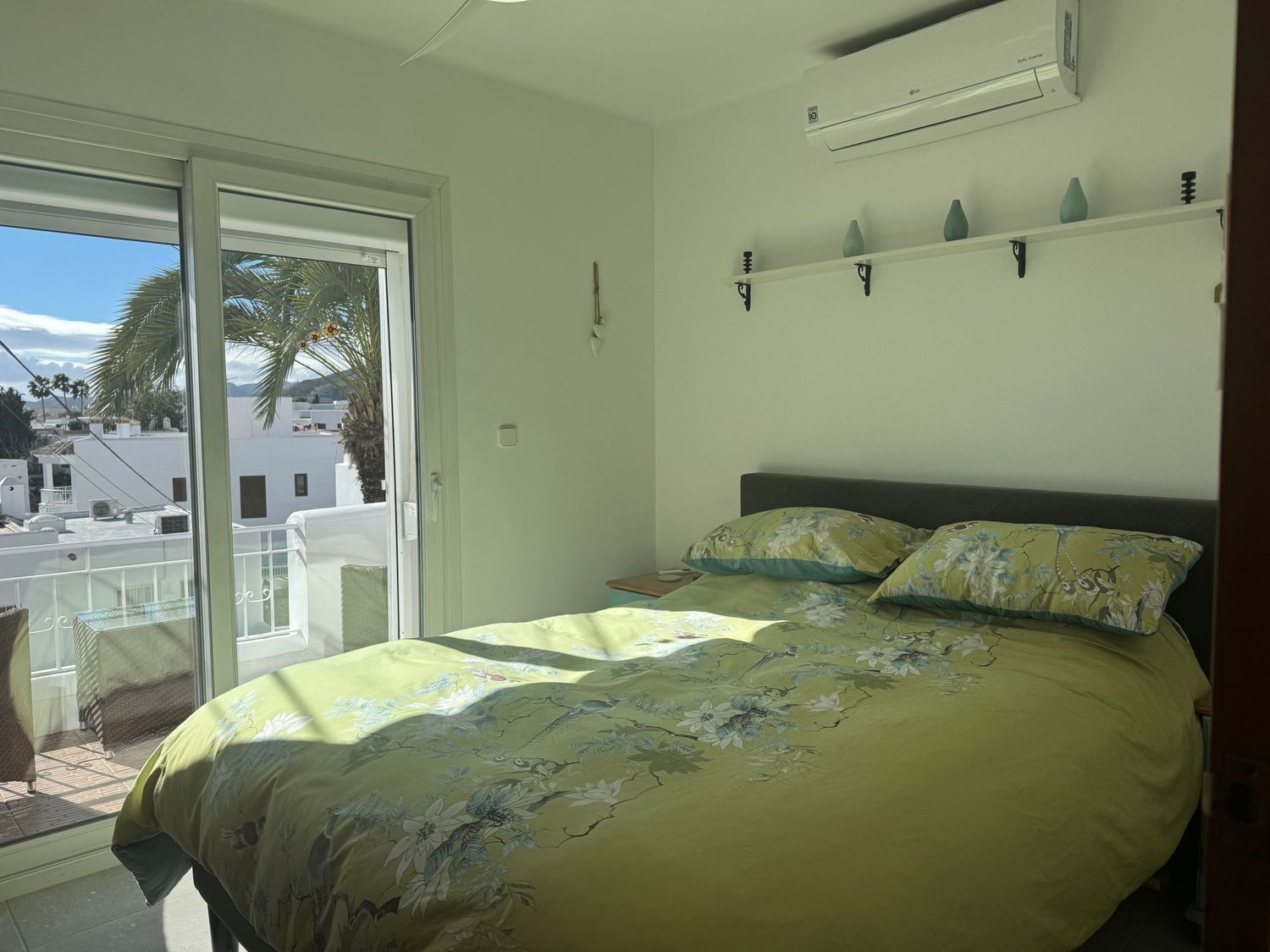 Desde el salón, una escalera conduce a la planta superior, destinada a la zona de descanso. Aquí se ubican dos dormitorios dobles, ambos equipados con aire acondicionado y armarios empotrados, ofreciendo comodidad y espacio de almacenamiento. Los dos dormitorios disfrutan de acceso directo a una terraza con vistas al mar, un espacio ideal para relajarse, tomar el sol o disfrutar de las vistas al amanecer o al atardecer.