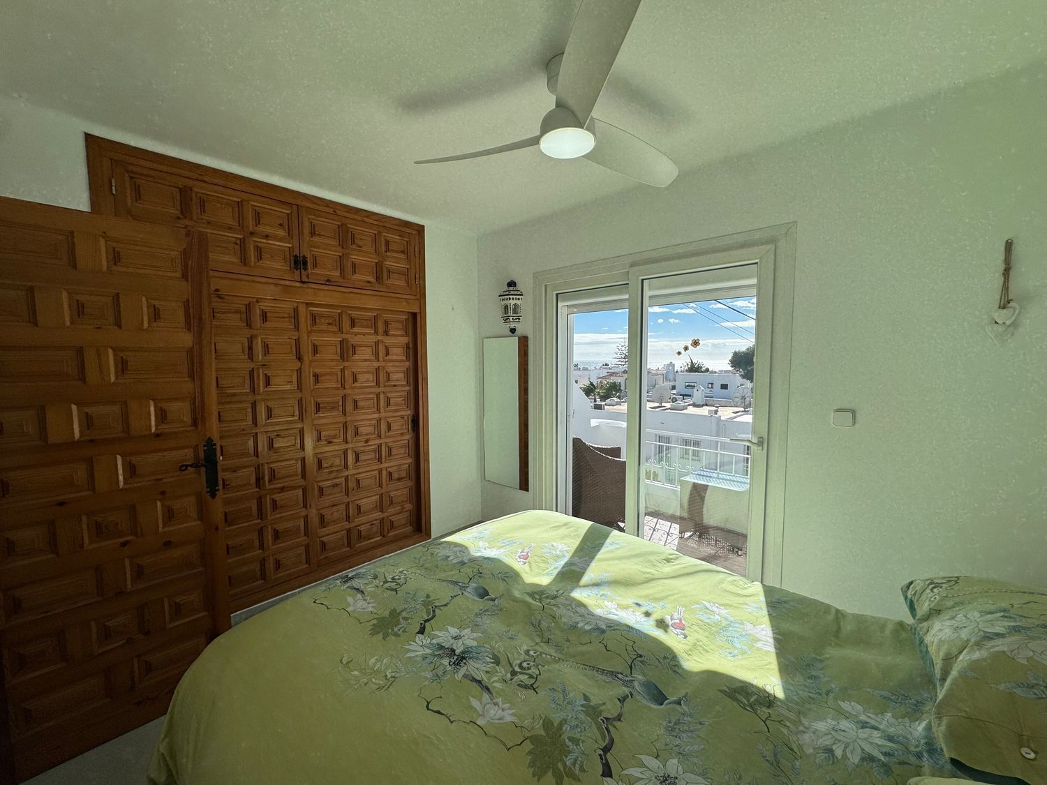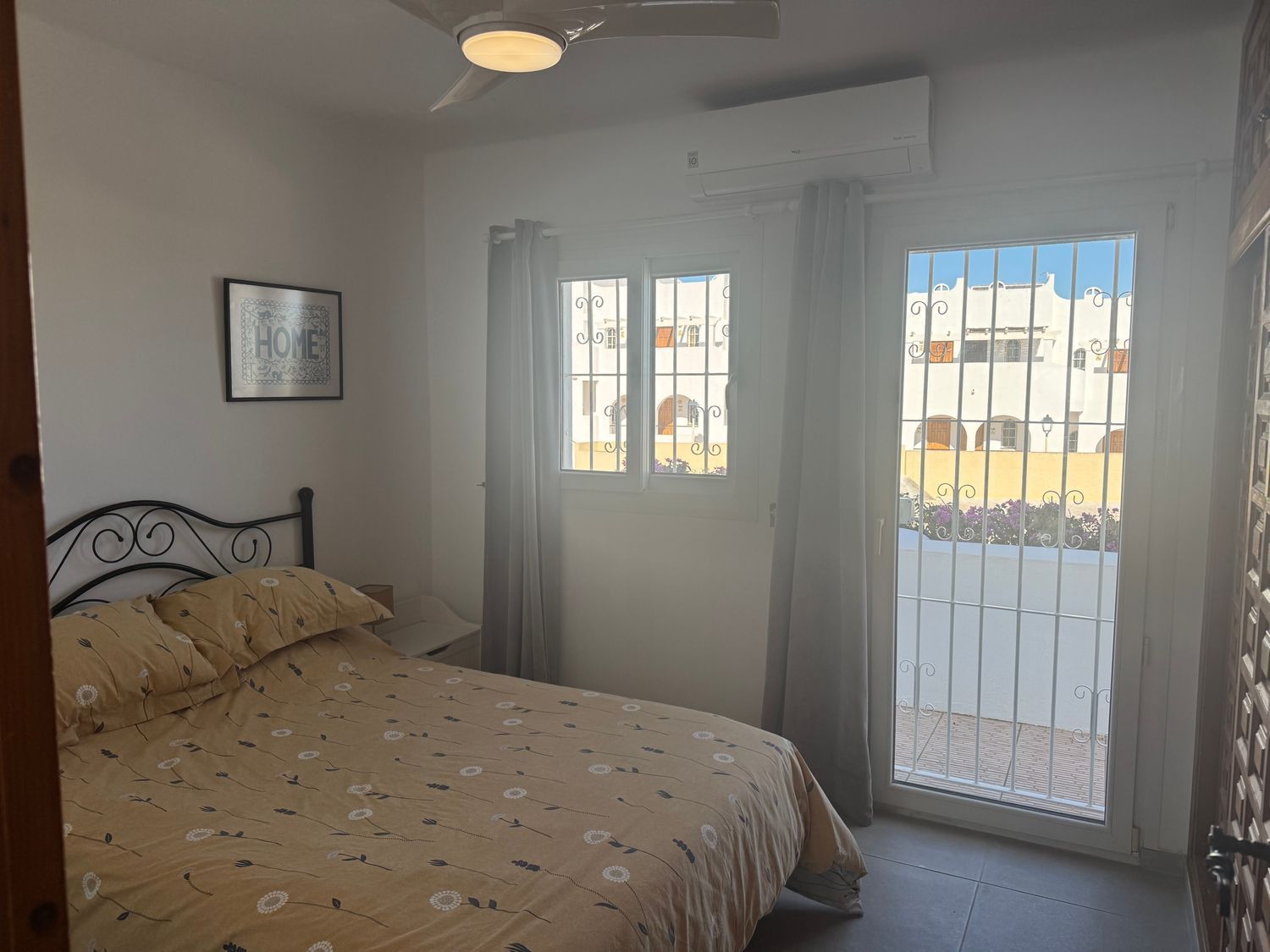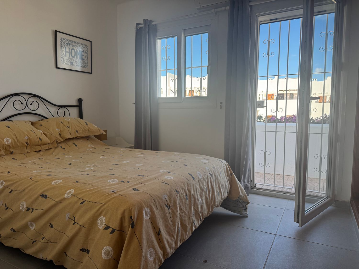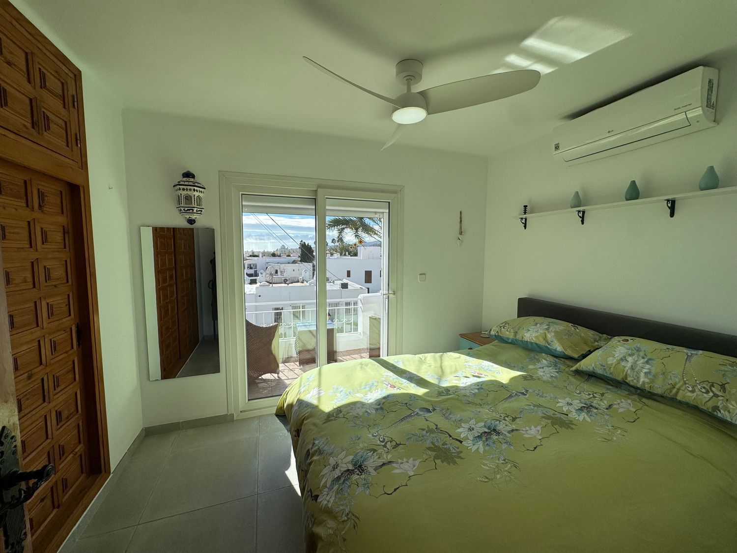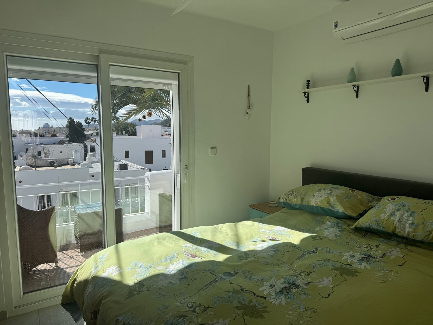 Desde el salón, una escalera conduce a la planta superior, destinada a la zona de descanso. Aquí se ubican dos dormitorios dobles, ambos equipados con aire acondicionado y armarios empotrados, ofreciendo comodidad y espacio de almacenamiento. Los dos dormitorios disfrutan de acceso directo a una terraza con vistas al mar, un espacio ideal para relajarse, tomar el sol o disfrutar de las vistas al amanecer o al atardecer.