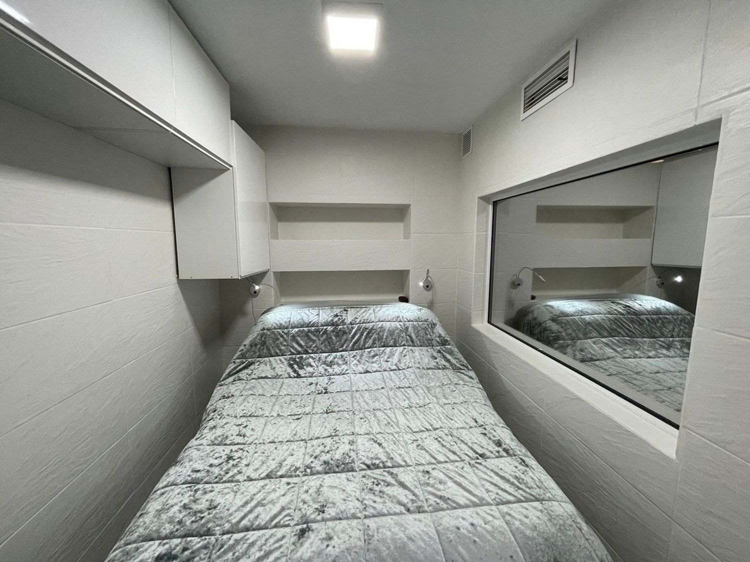 El acceso se realiza a través de una escalera que conduce a la entrada principal. Al cruzar la puerta, encontramos un pequeño recibidor que organiza perfectamente la distribución interior. A la izquierda se sitúa el dormitorio, equipado con almacenamiento empotrado que optimiza el espacio y mantiene el orden visual. Frente a la entrada se encuentra el baño contemporáneo, moderno y funcional, con ducha a ras de suelo, acabados actuales y diseño práctico. En esta misma zona existe además un espacio adicional de almacenamiento muy útil.