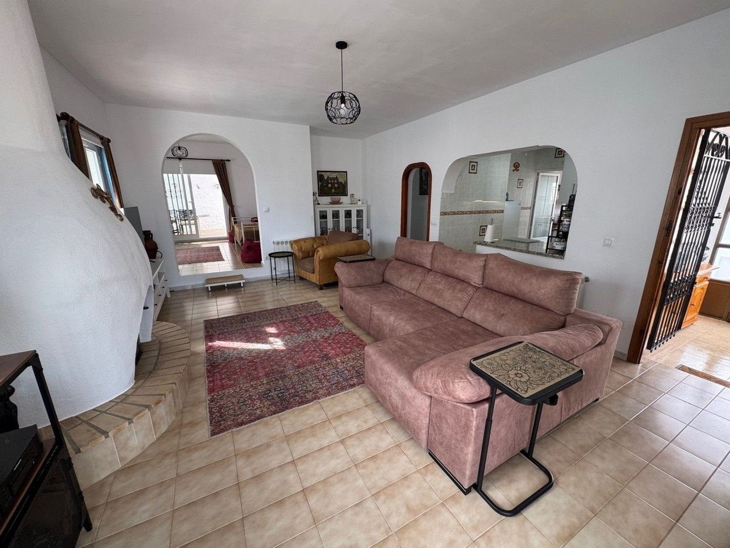 Desde aquí pasamos al salón con cocina de concepto abierto, un espacio acogedor y luminoso que dispone de chimenea, ideal para los meses más frescos. La cocina ofrece buen espacio de almacenamiento y comunica con una zona de servicio independiente, ambas estancias con ventanas que aportan ventilación y luz natural.
