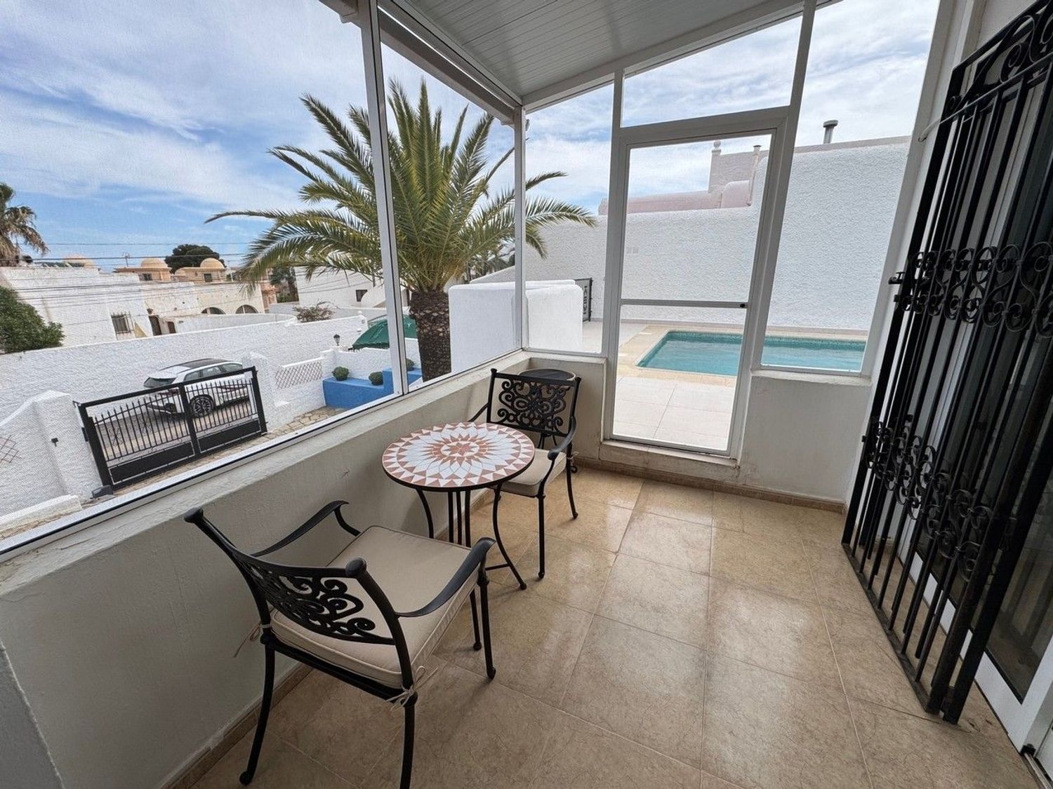 Al entrar en la vivienda se accede a un luminoso solárium acristalado, actualmente utilizado como comedor. Este espacio, lleno de luz natural, también conecta con la terraza junto a la piscina, protegida con cerramiento y mosquitera para mayor comodidad.