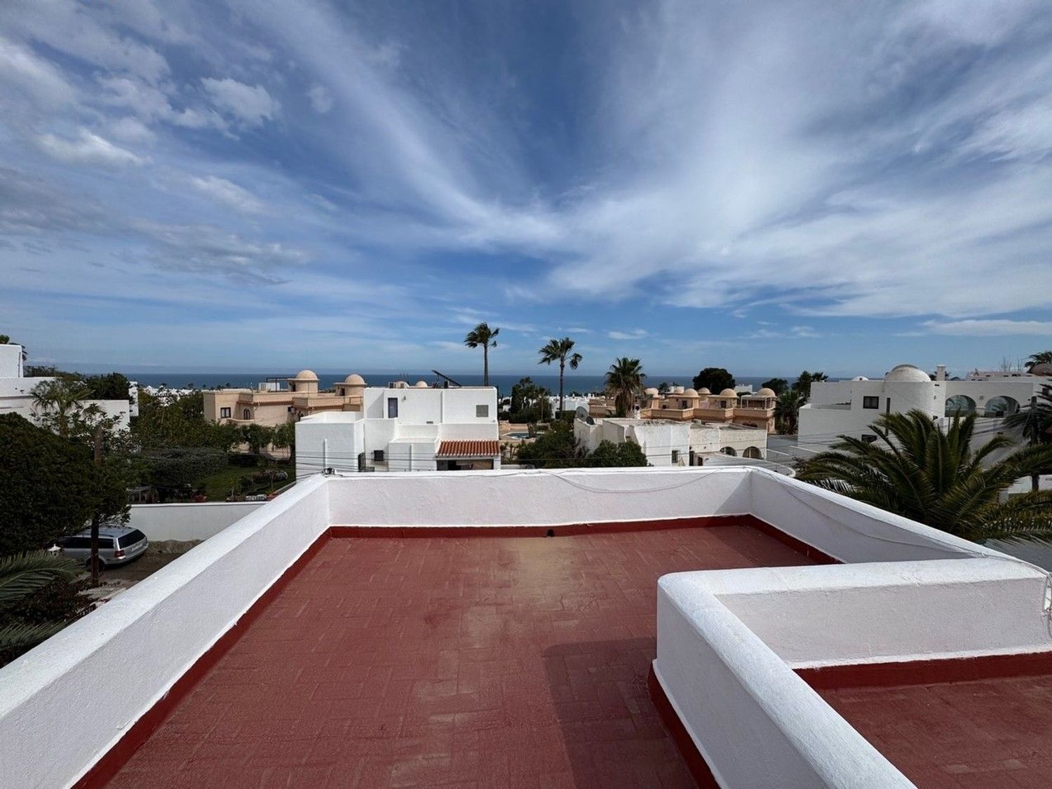 Desde esta terraza unas escaleras exteriores conducen al solárium de la azotea, donde se pueden disfrutar de impresionantes vistas panorámicas de 360° al mar, las montañas y el pintoresco pueblo de Mojácar.