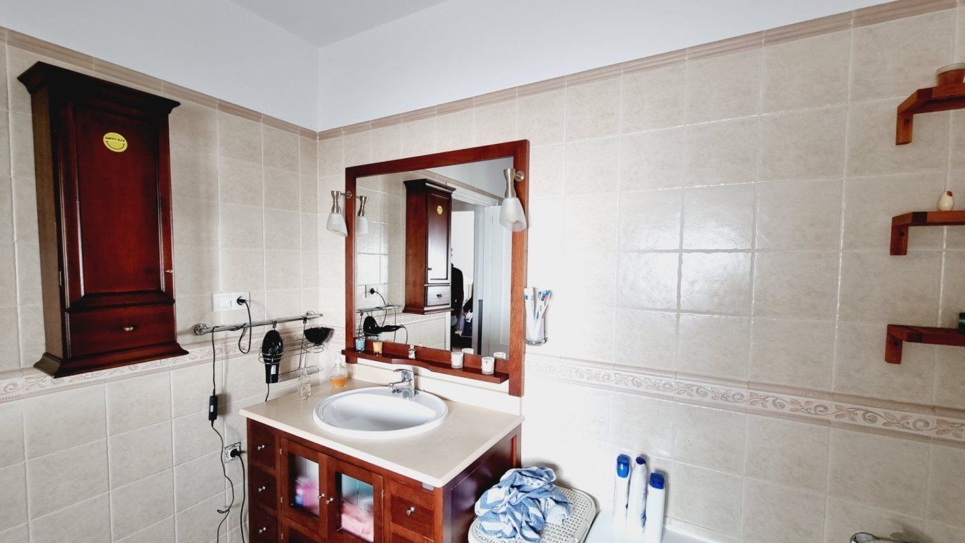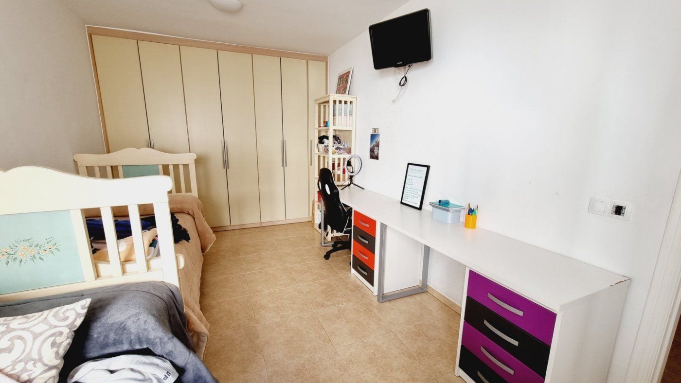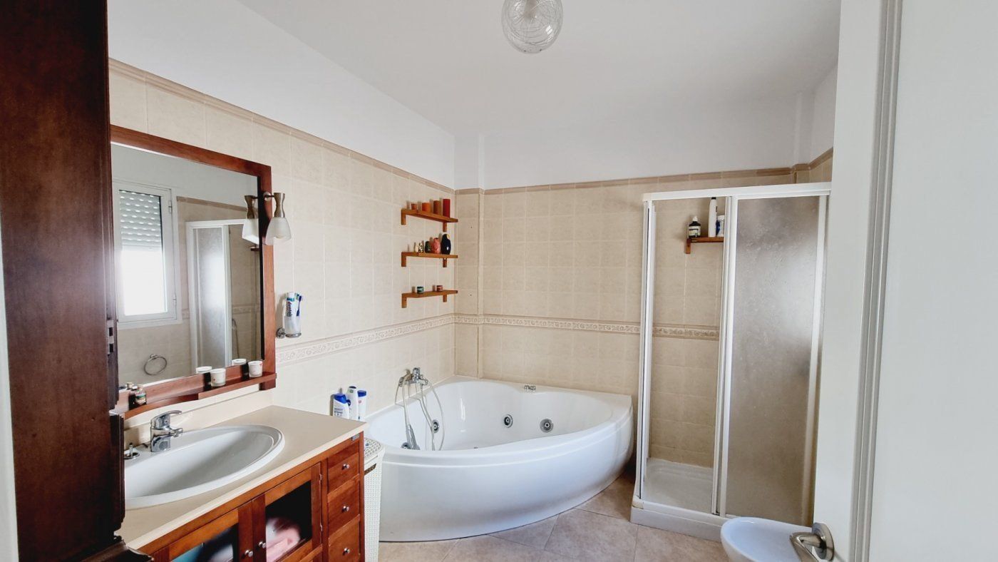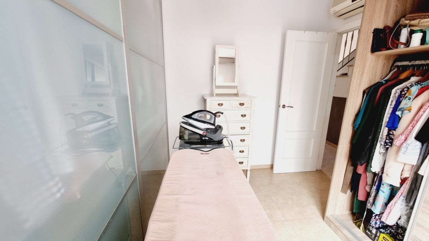 La planta superior alberga los tres dormitorios, todos ellos amplios y luminosos. El dormitorio principal destaca por su vestidor y baño en suite con bañera de hidromasaje, creando un ambiente íntimo y relajante. Los otros dos dormitorios comparten un baño completo y cuentan con acceso a una terraza privada, perfecta para disfrutar del clima mediterráneo.