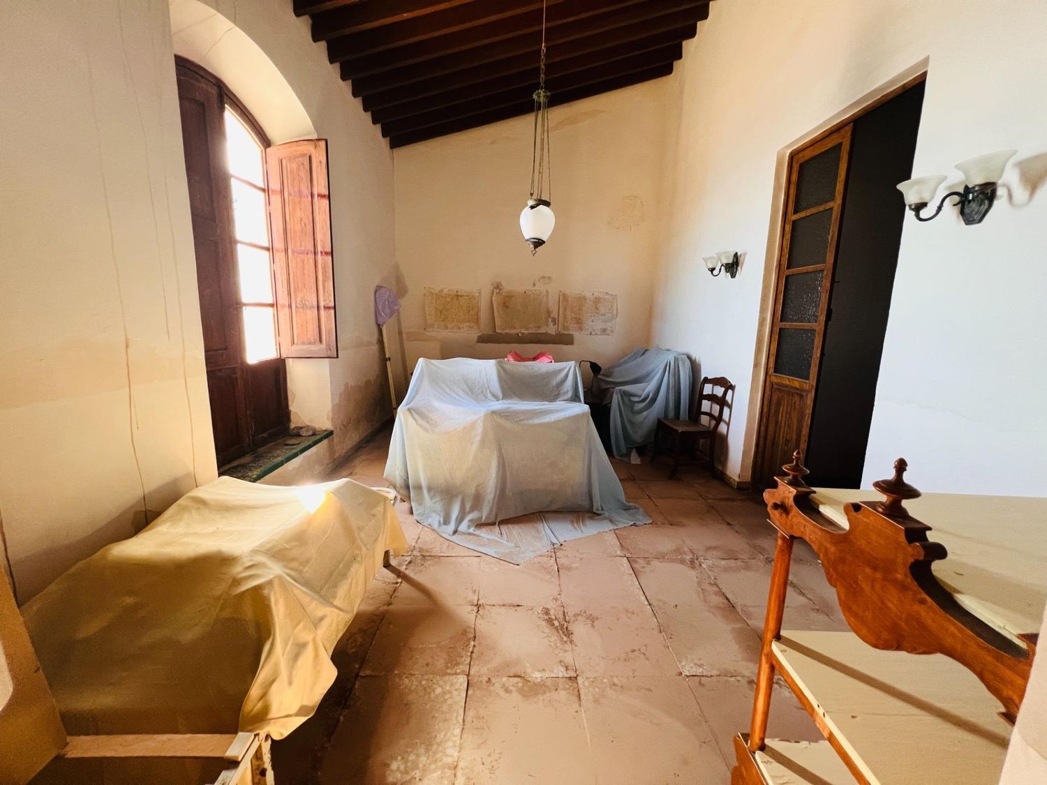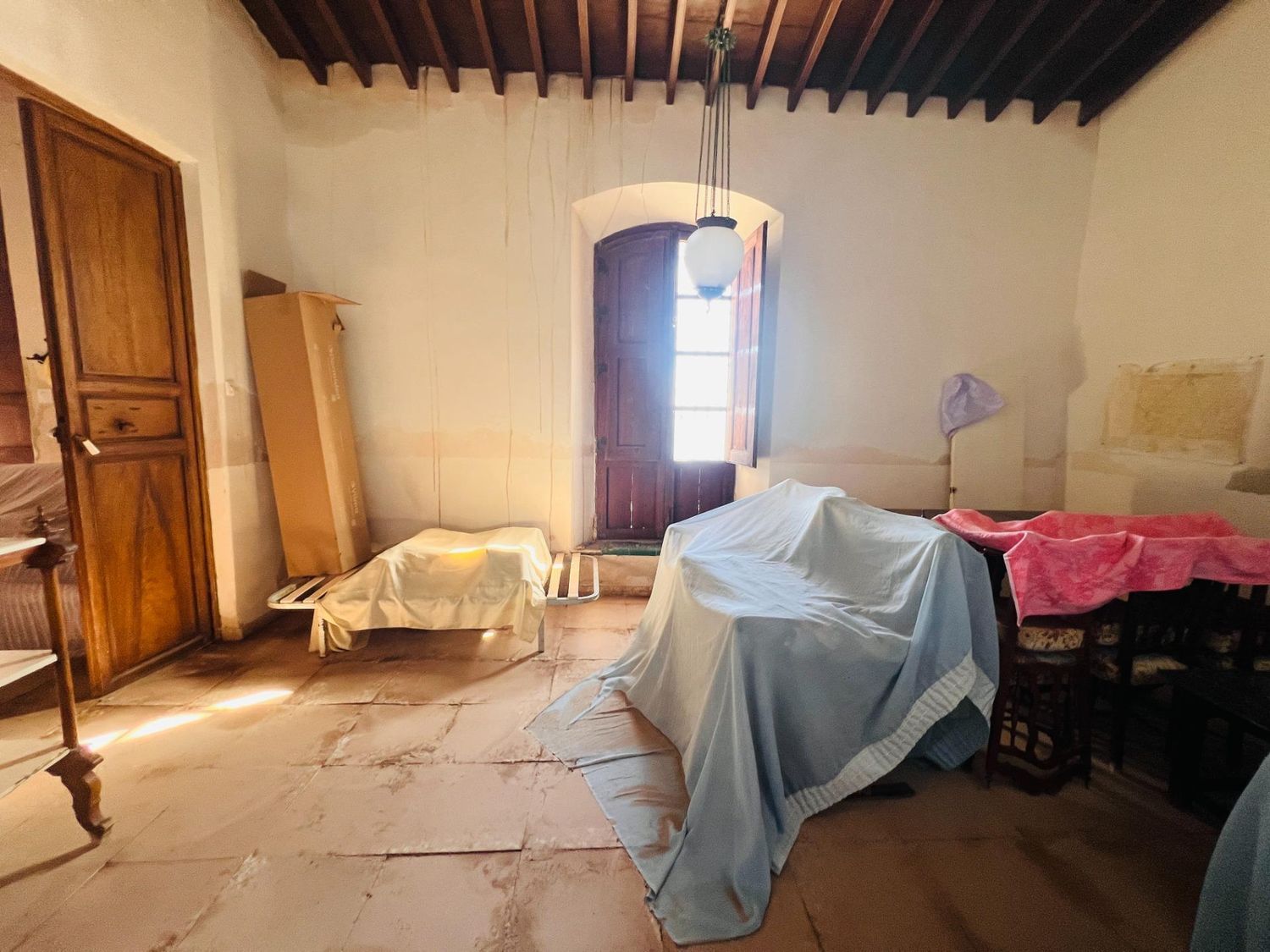 Le grand salon-salle à manger se distingue par ses plafonds hauts avec poutres en bois apparentes, apportant charme et caractère à l’ensemble de la maison.
